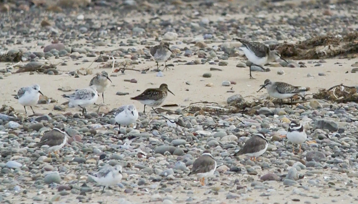 Crymlyn Burrows – 3 Curlew Sandpipers at the shingle ridge wader roost this evening. The other waders were not counted but I suspect they were holding to recently taken counts. Other notable stuff included a Gannet in the Bay and an adult Common Gull with a metal ring on it’s left leg – no chance of reading the details though [MHn, MHi]