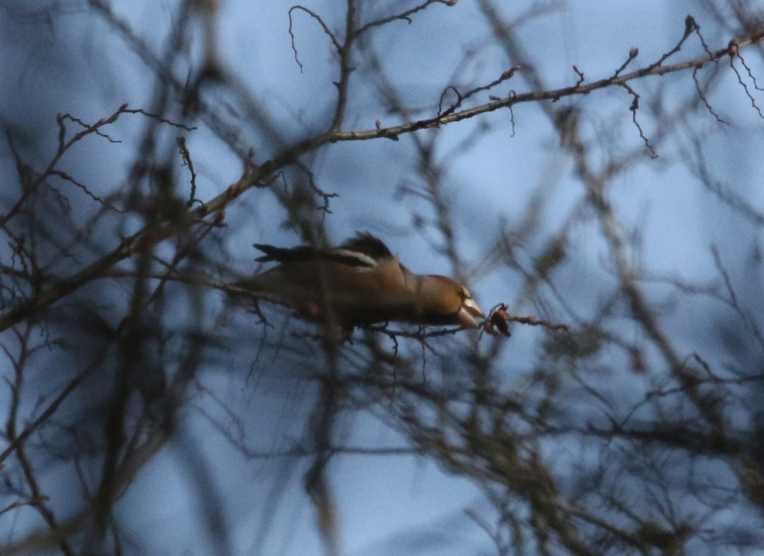 Decided to have a go for the Hawfinches despite the wind. Nothing doing by the white cottage but walking along the bridal path in the wood a flock flew up from low down [no doubt sheltering] and headed down valley. They eventually came back and flitted around in the tree tops up towards the top road. I reckon the flock was about 20 strong. Managed a couple of heavily cropped record shots in appalling conditions [trees shaking around and buffeting me]: