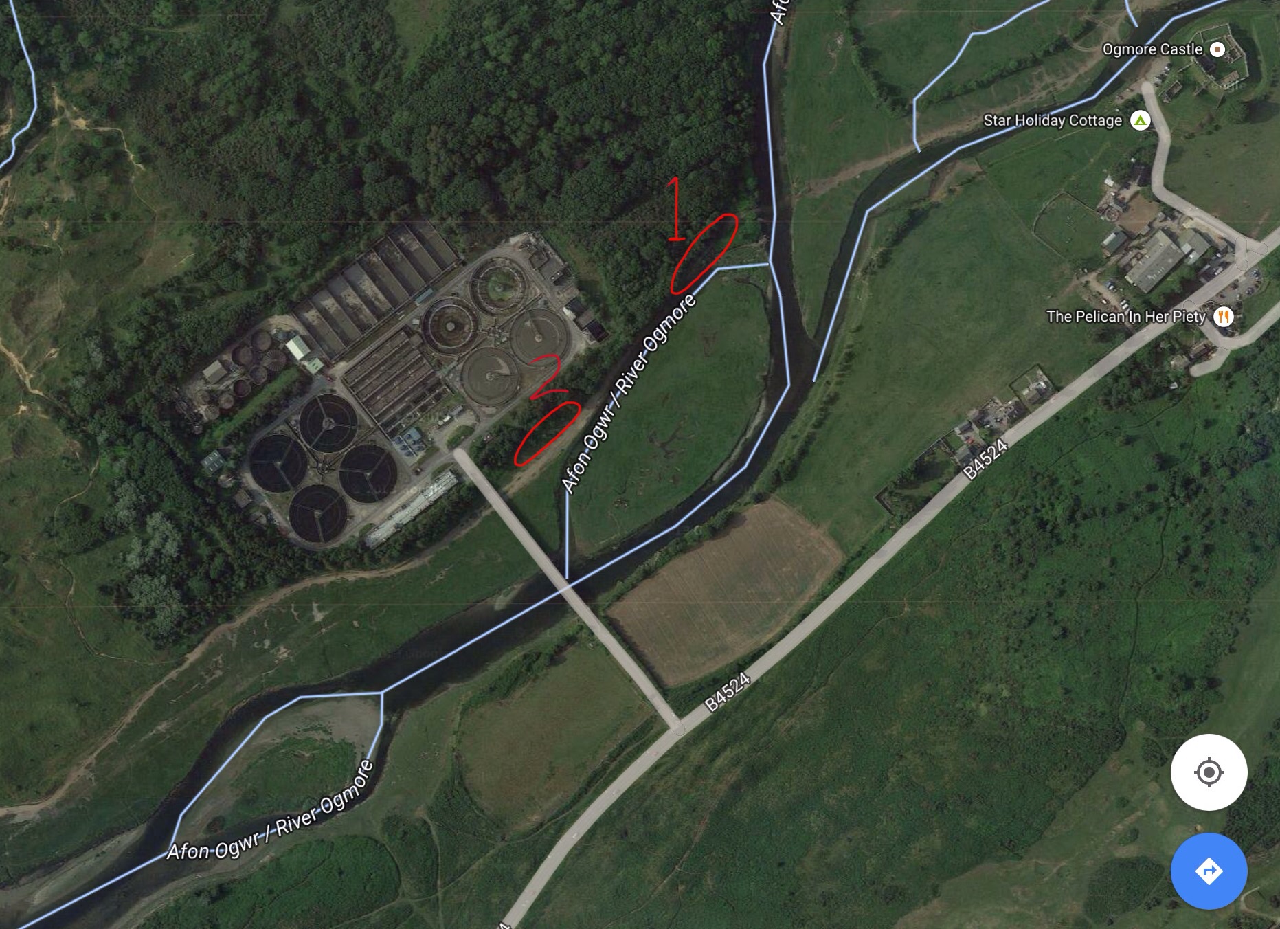 Also, I have heard that the Firecrest was still present today by the sewage works. The aerial below shows its location. Recently it has been favouring area 1, just upstream of the horse crossing, but I have also seen it at area 2. The location can be accessed from Merthyr Mawr or Candleston, unfortunately there is no access over the sewage works bridge.
