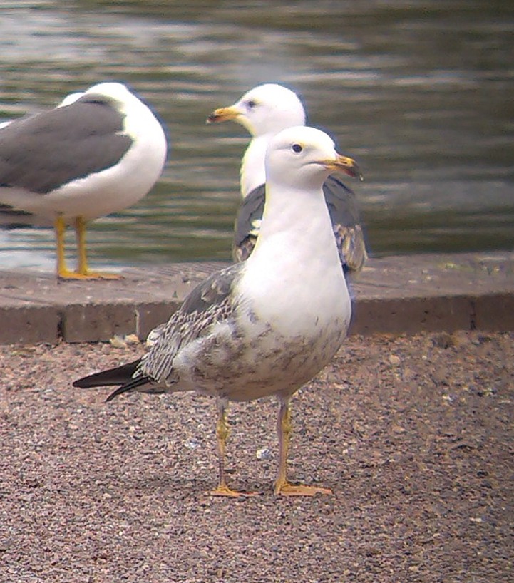 Fairly quiet on the passerine front – too windy. A pair of Mistle Thrushes have a nest in the wood on the N side to E lake [busy chasing Magpies away this morning]. E lake had about 30 Swallow and 10 Sand Martin , but still no Swift there. LBB Gull with white Darvic red letters 9ZF present, and also this very clean headed 2nd year ?LBBG – I can’t make it into anything rarer. This is a cropped digi-phone-binned pic.
