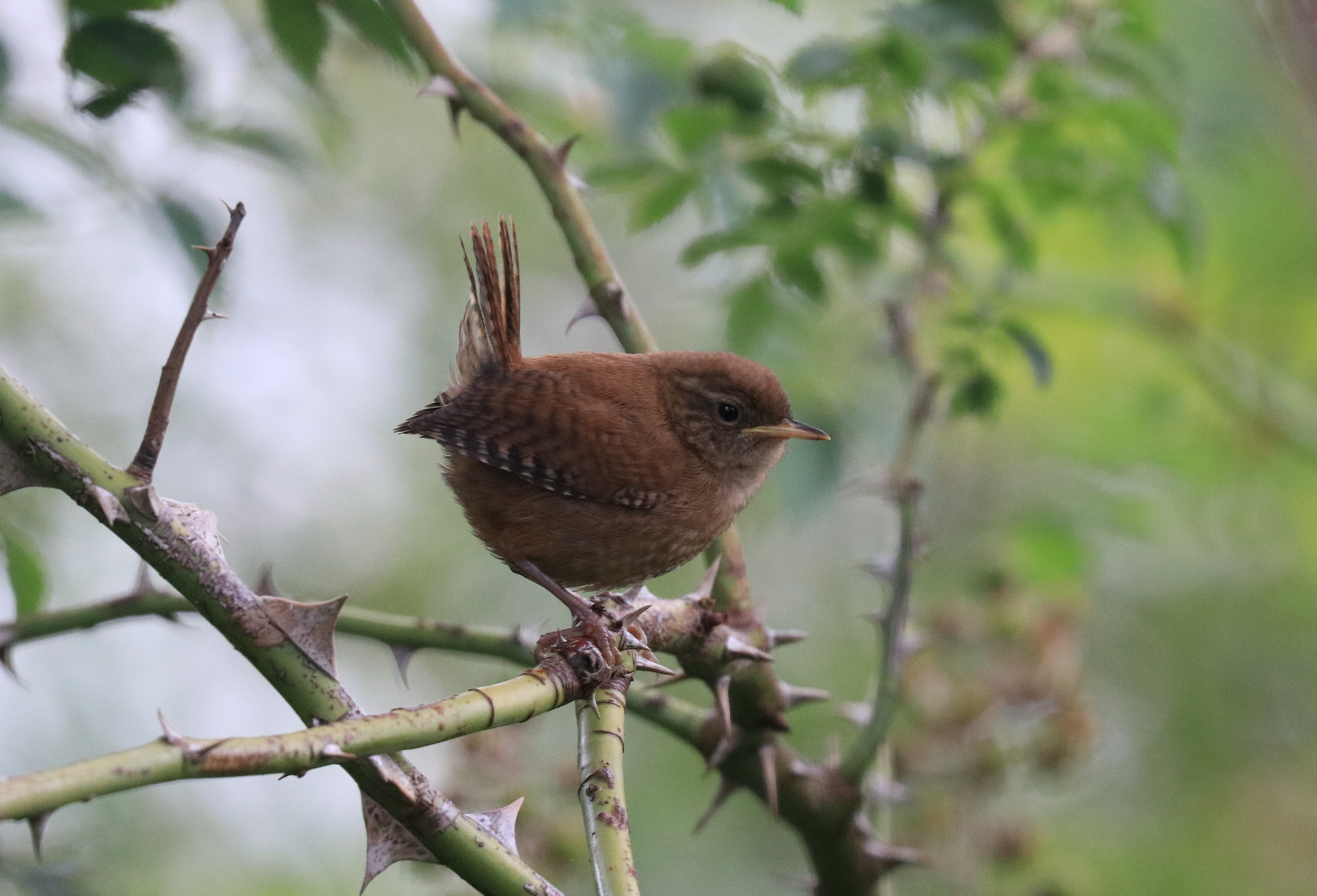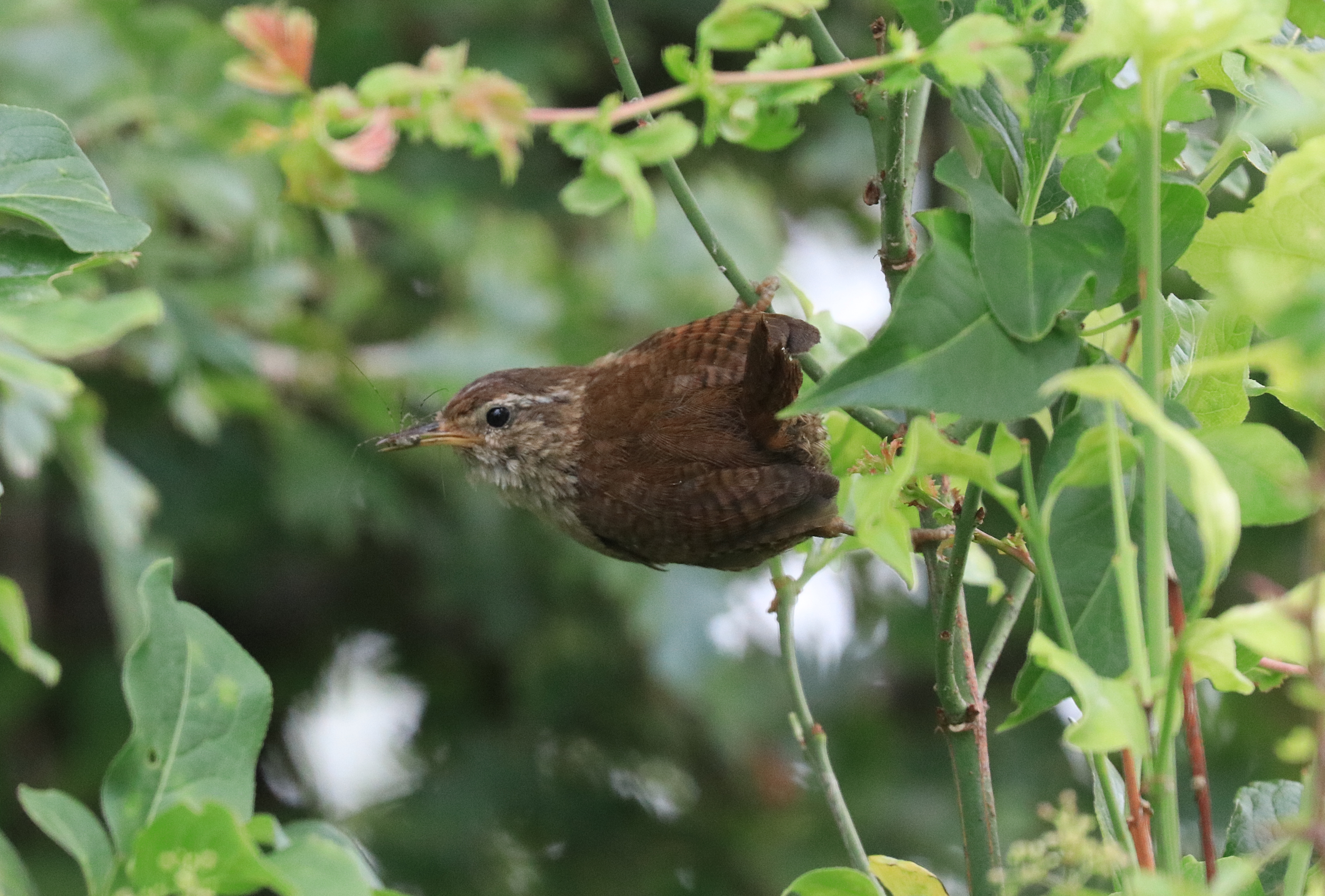 Some passerine activity again, this time along the central west paddock hedgerow this morning with a party of Long-tailed Tits accompanied again by Willow Warbler, Blue Tits, a Greenfinch! , a few Linnets and Goldfinch. The Wren popped up near me by the central viewpoint along the main path. Didn’t realise until I looked at the photo on the computer that in my first shot of it, it had a Harvestman in its beak. Just liked the juv Moorhen pretending to be a skulky rare Crake! And the last one, a Devil’s Coach Horse Beetle {Ocypus olens} a species of rove beetle. Haven’t seen one for ages. Also had 3 Painted Ladies in a brief visit b4 rushing off to the dentist!