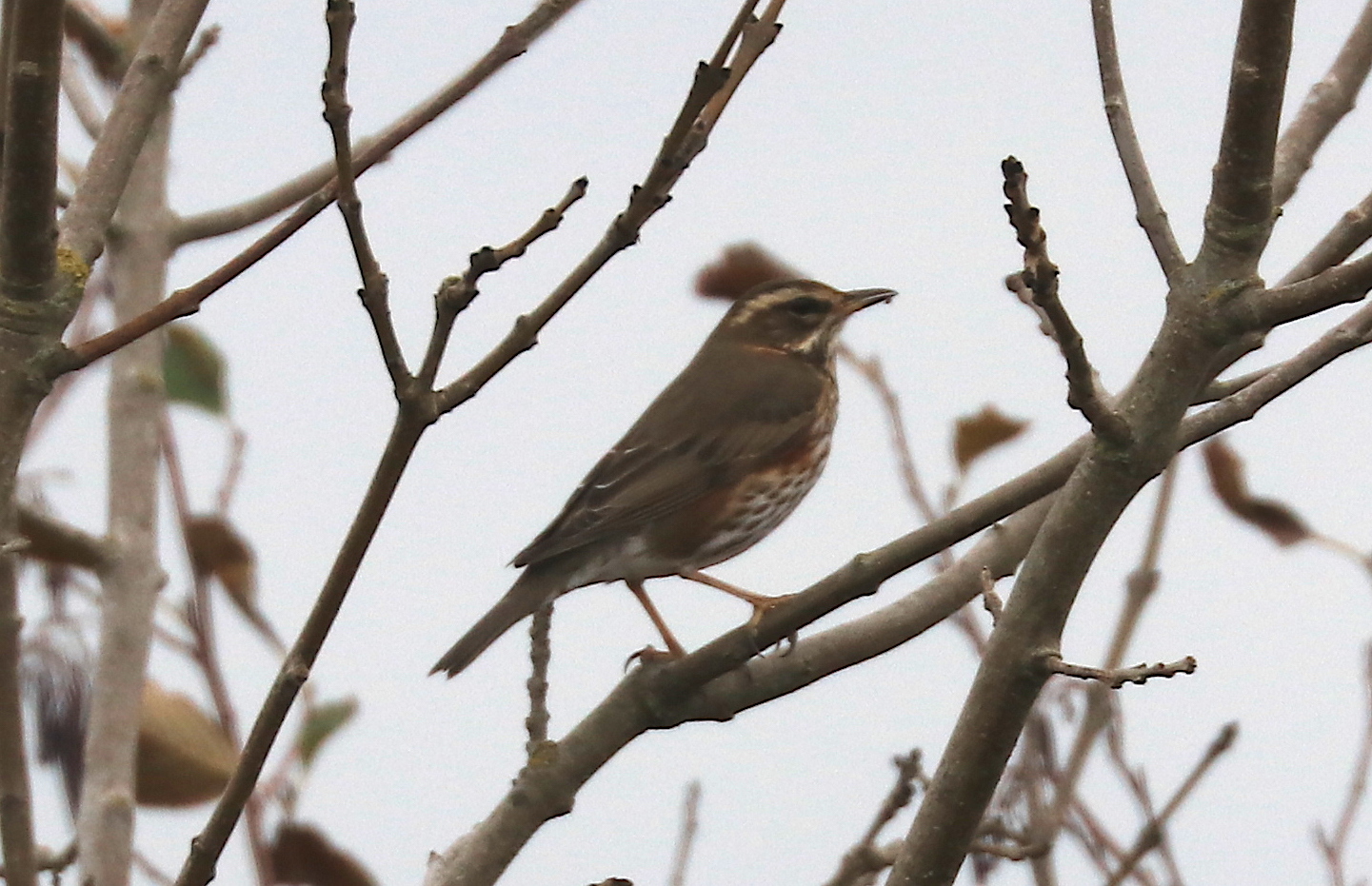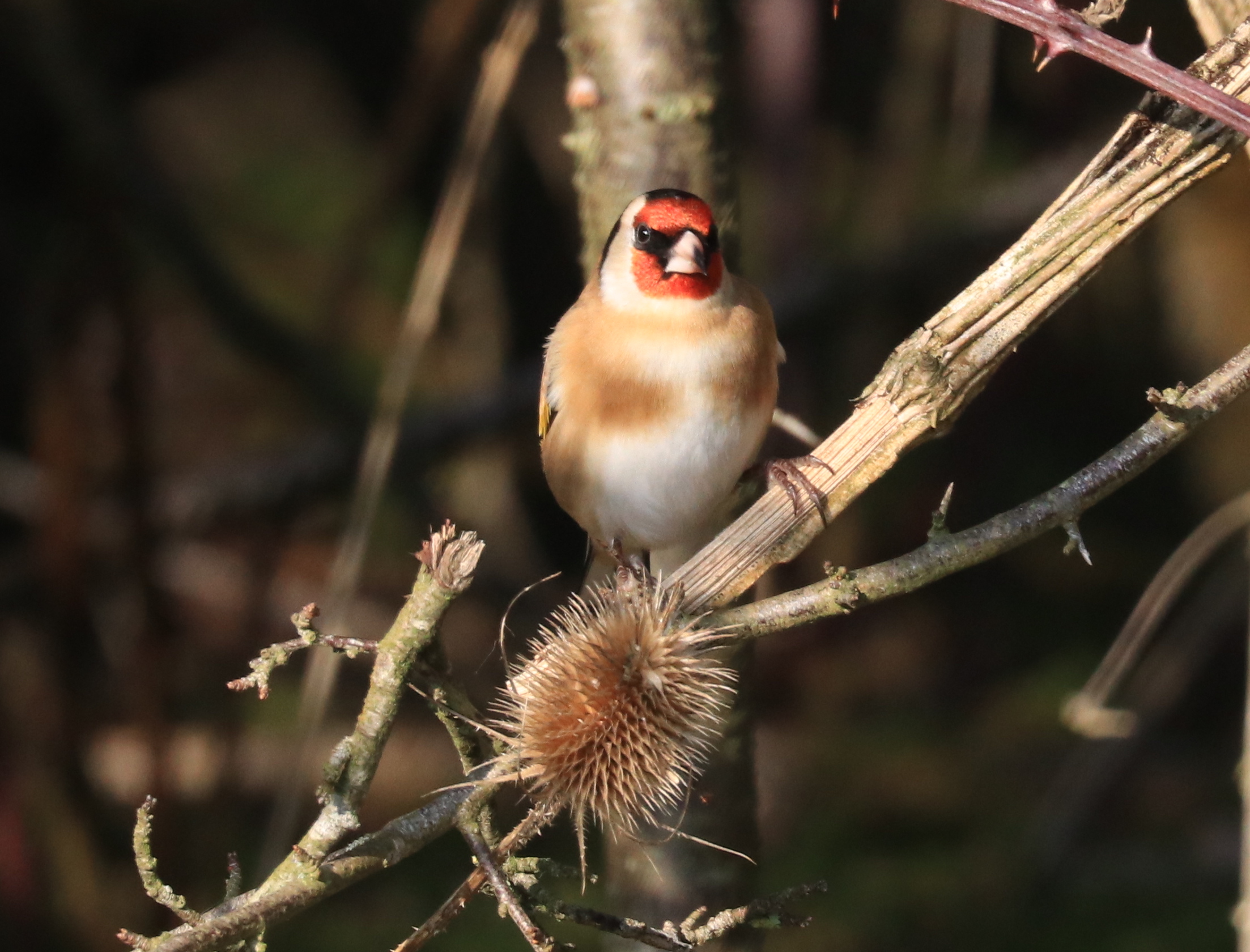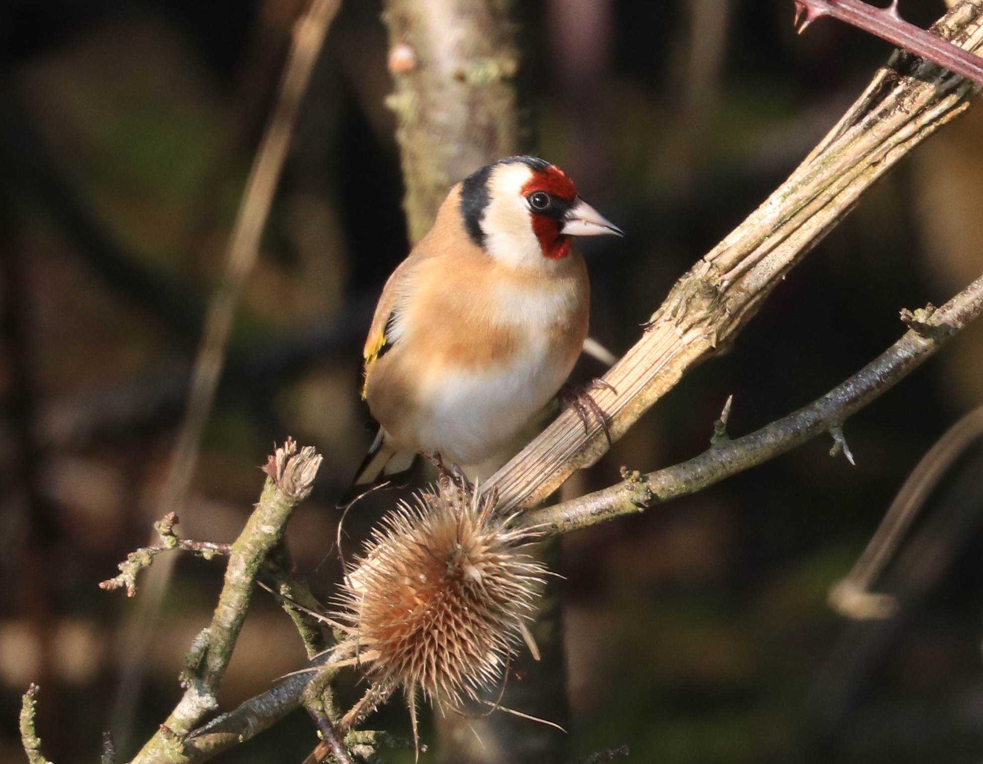 A Sparrowhawk was in a tree in the snipe paddock then flew off. A few Redwing scattered around, and nice Song Thrush by E paddock. A Kingfisher was briefly by the dragonfly pond but flew off [it had a thin layer of ice]. A lone Goldfinch was all alone feeding on a teasel, 2 Reed Buntings by the dipping pond.