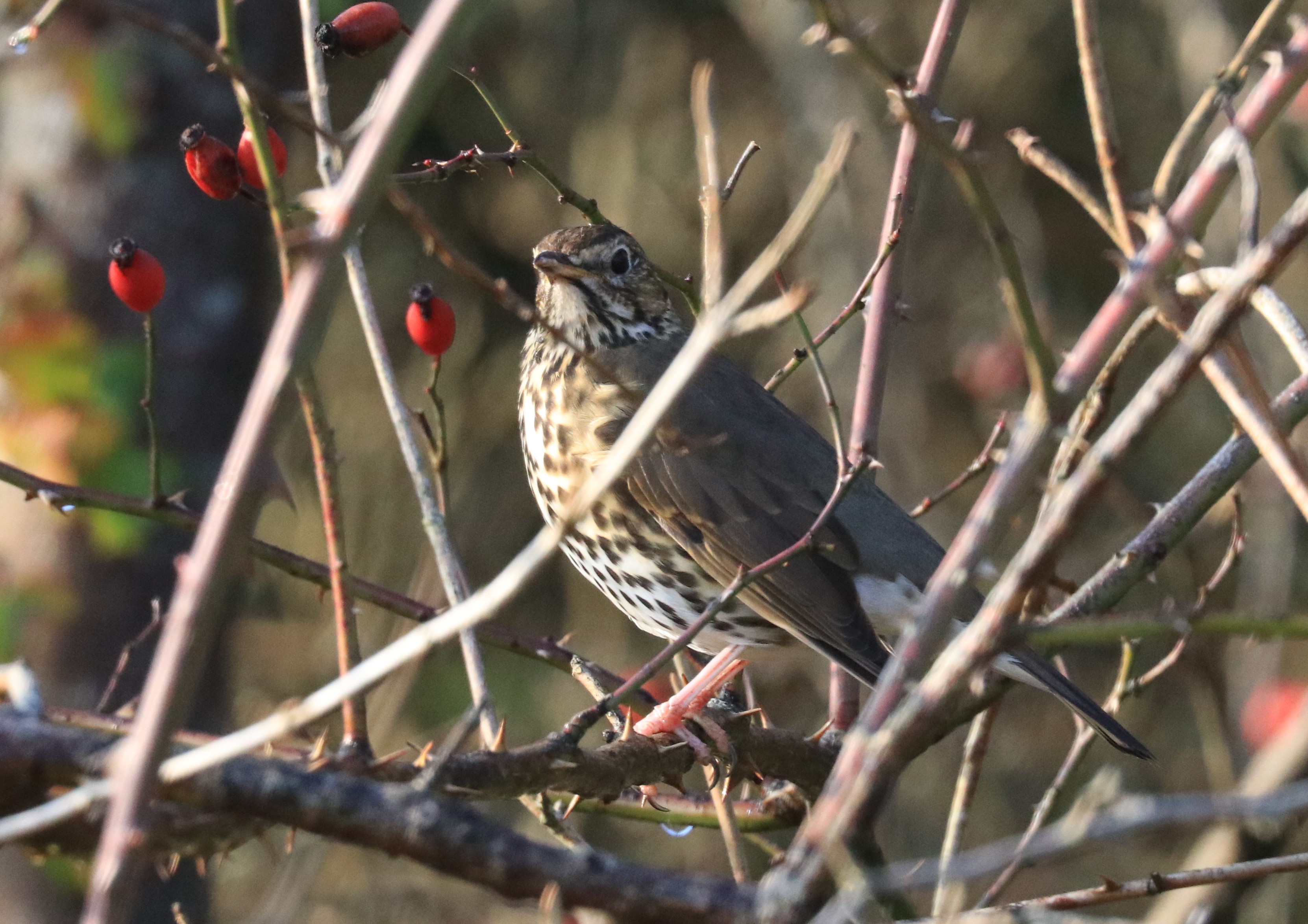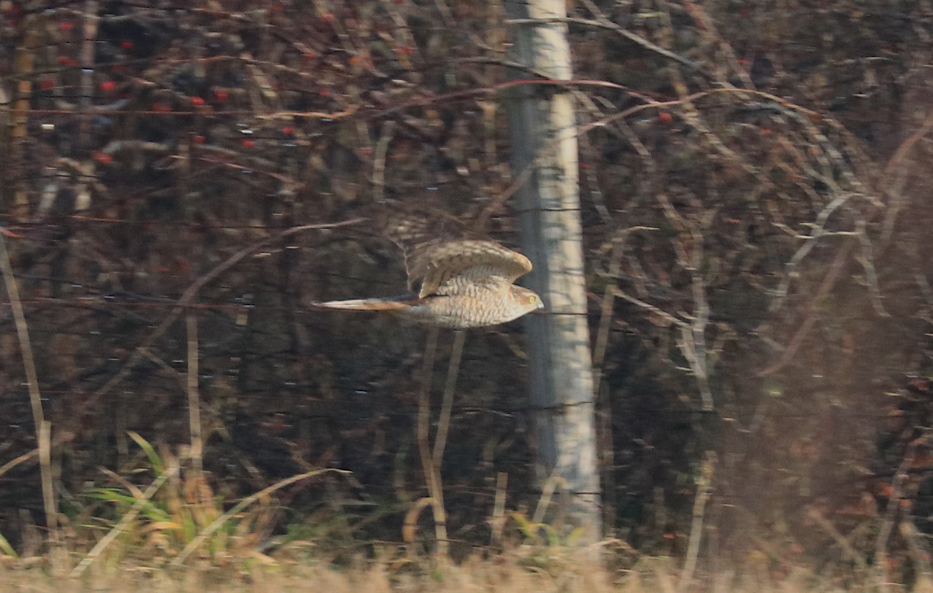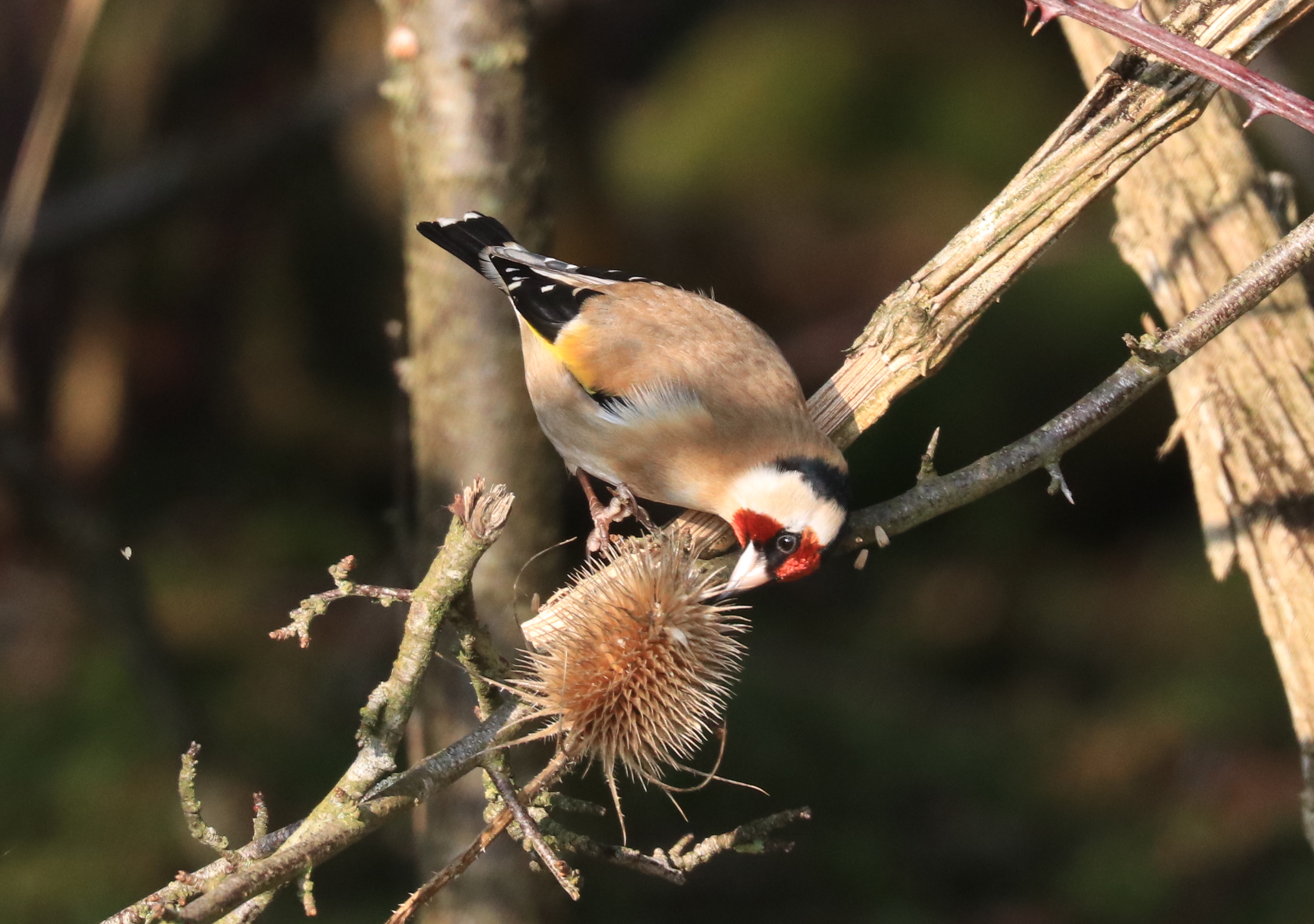 A Sparrowhawk was in a tree in the snipe paddock then flew off. A few Redwing scattered around, and nice Song Thrush by E paddock. A Kingfisher was briefly by the dragonfly pond but flew off [it had a thin layer of ice]. A lone Goldfinch was all alone feeding on a teasel, 2 Reed Buntings by the dipping pond.