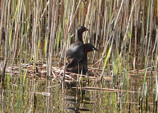 Had a ‘lifer’ today – a pair of Little Grebes mating at Cosmeston this morning. I’ve never seen this before. The photo is a big crop as they were quite distant. Also unusual in that they’ve apparently made a nest [on which they are performing], in full view in the edge of the reeds. Usually it’s impossible to see where they’ve nested. A GC Grebe pair have 2 ‘humbug’ young – that pic is an even bigger crop. Also Moorhen and Coot chicks on view. Also 2 Kingfishers, one carrying a fish from W lake to E [poss breeding again?], the other bird was perched in the middle of w lake reeds.
