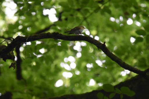 Between 4 and 5 in the afternoon. Grid reference is 084832. As you come down the ridge on the public footpath from Soar, the path drops down on the north side of the ridge. there is a distinct tump just before the old quarry workings and the Wood Warbler was in the trees to the south of the tump. We think we heard other Wood Warblers along the path south towards Tyn-y-Coed Road.