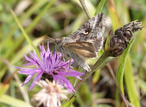 Pretty quiet on a walk through E and W paddocks this morning. The Silver-Y moth was nice to see [see pic]. A Sparrowhawk was circling over E lake when I arrived and another was with 1 of the 4 Buzzards of the other day, over the Dovecote field. Buzzards very vocal again today. A Jay was in the edge of Cogan Wood at the southern entrance. There were a lot of Swallows circling high above the Dovecote field. In the pouring rain yesterday there were about 20 Sand Martins and a couple of House Martins flying around just above the surface of W lake.