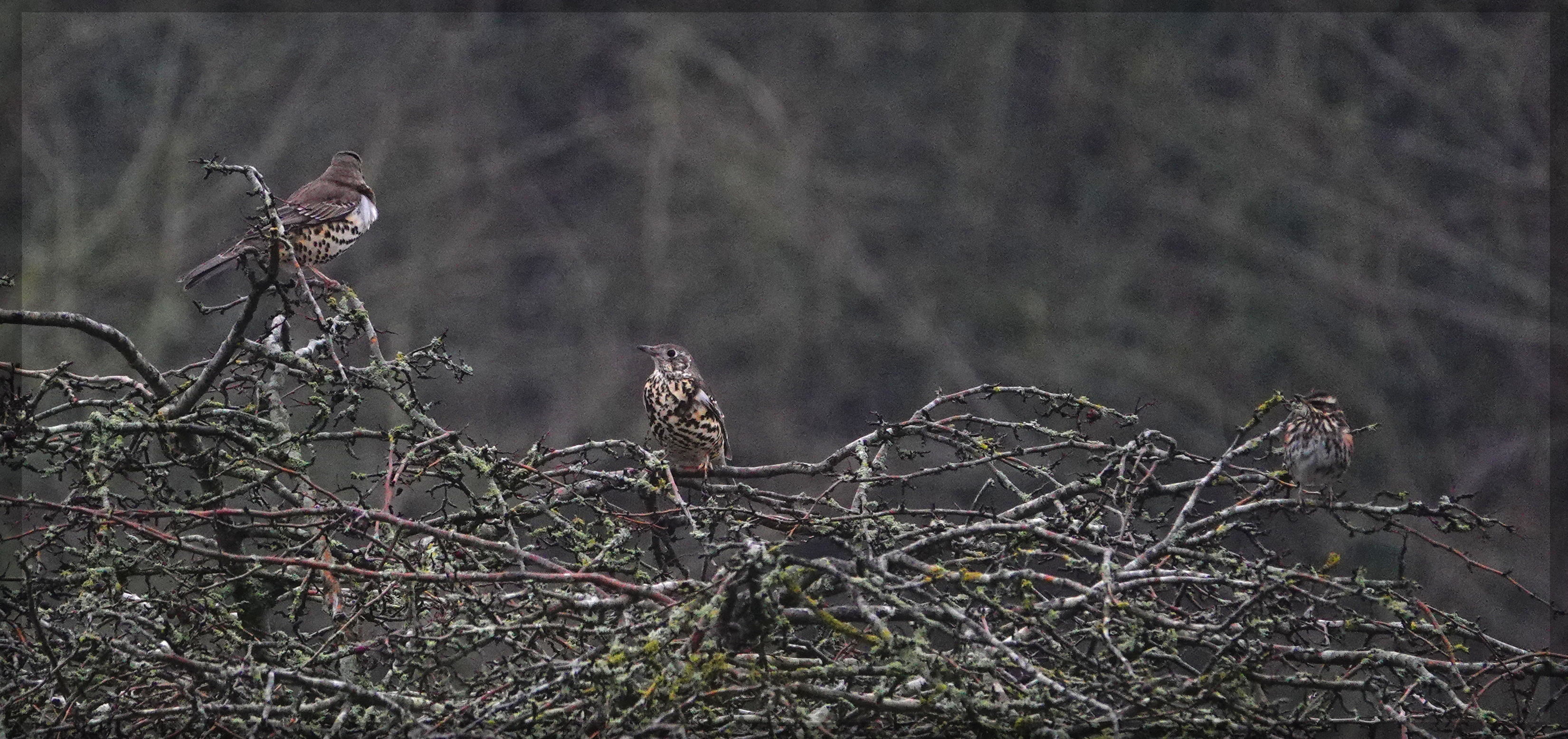 From this morning, a couple of the best photos I managed of the Ring-necked Duck – they’re very grainy due to big crops and the really dismal light. Also a couple of Mistle Thrushes and a Redwing near W paddock.
