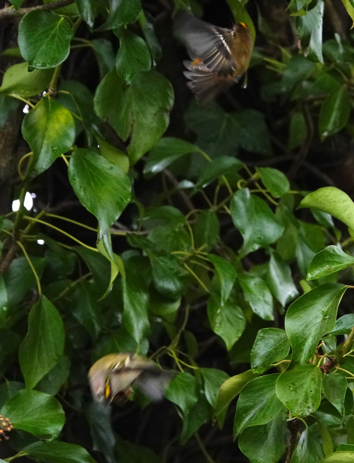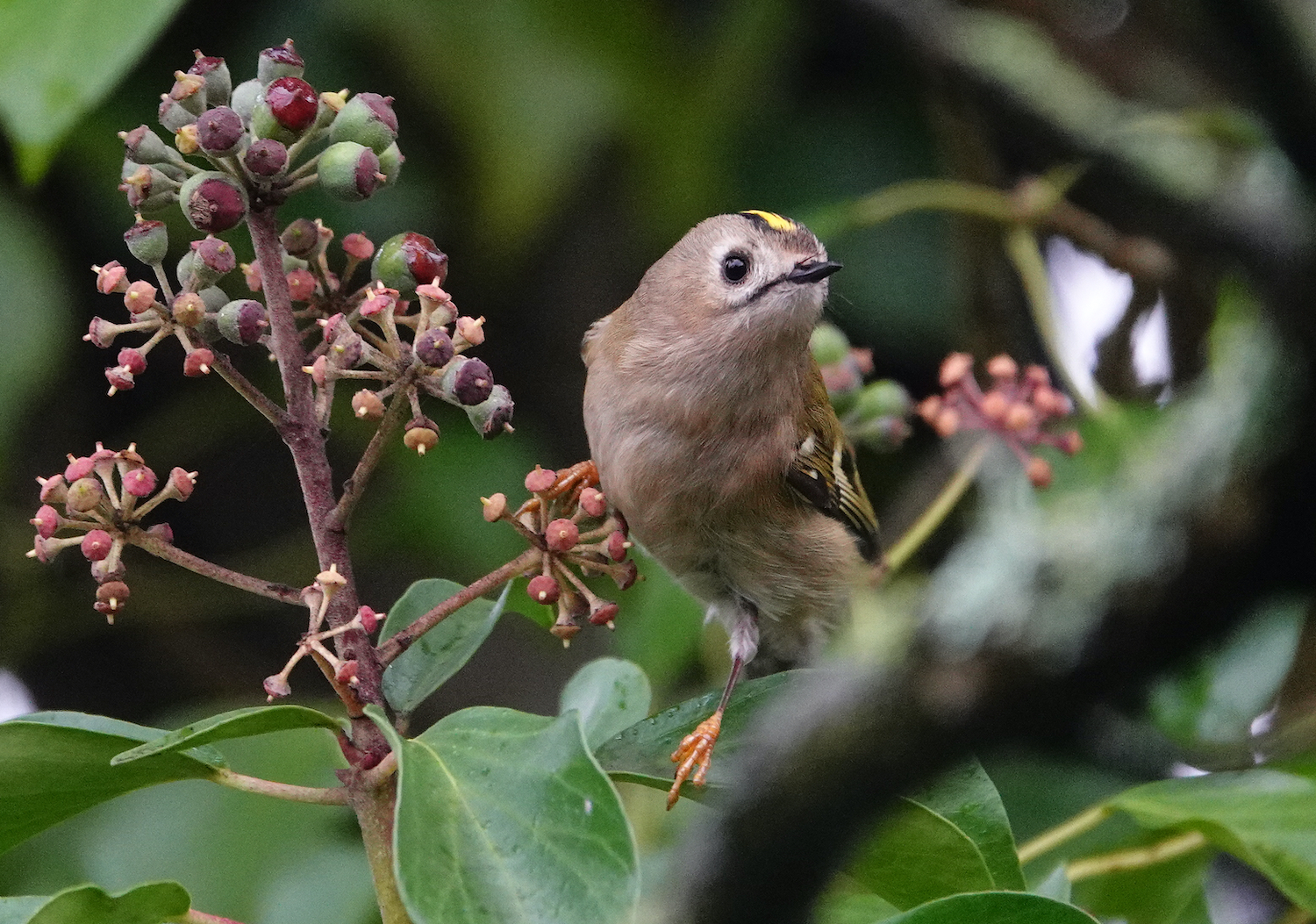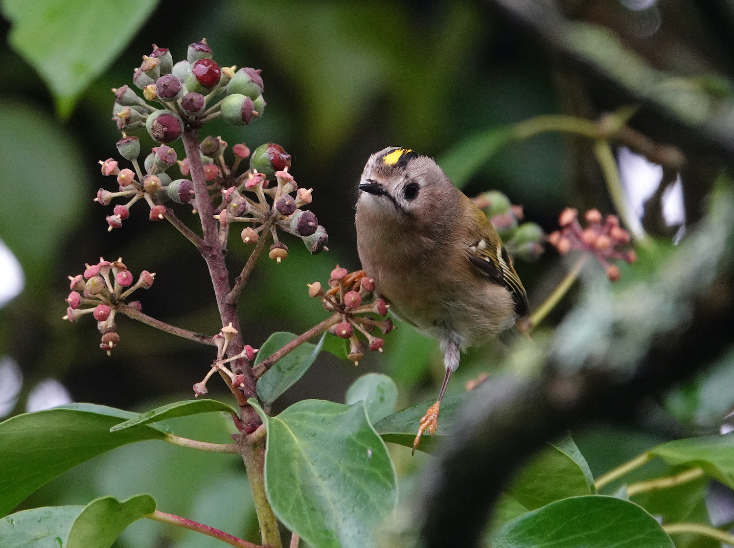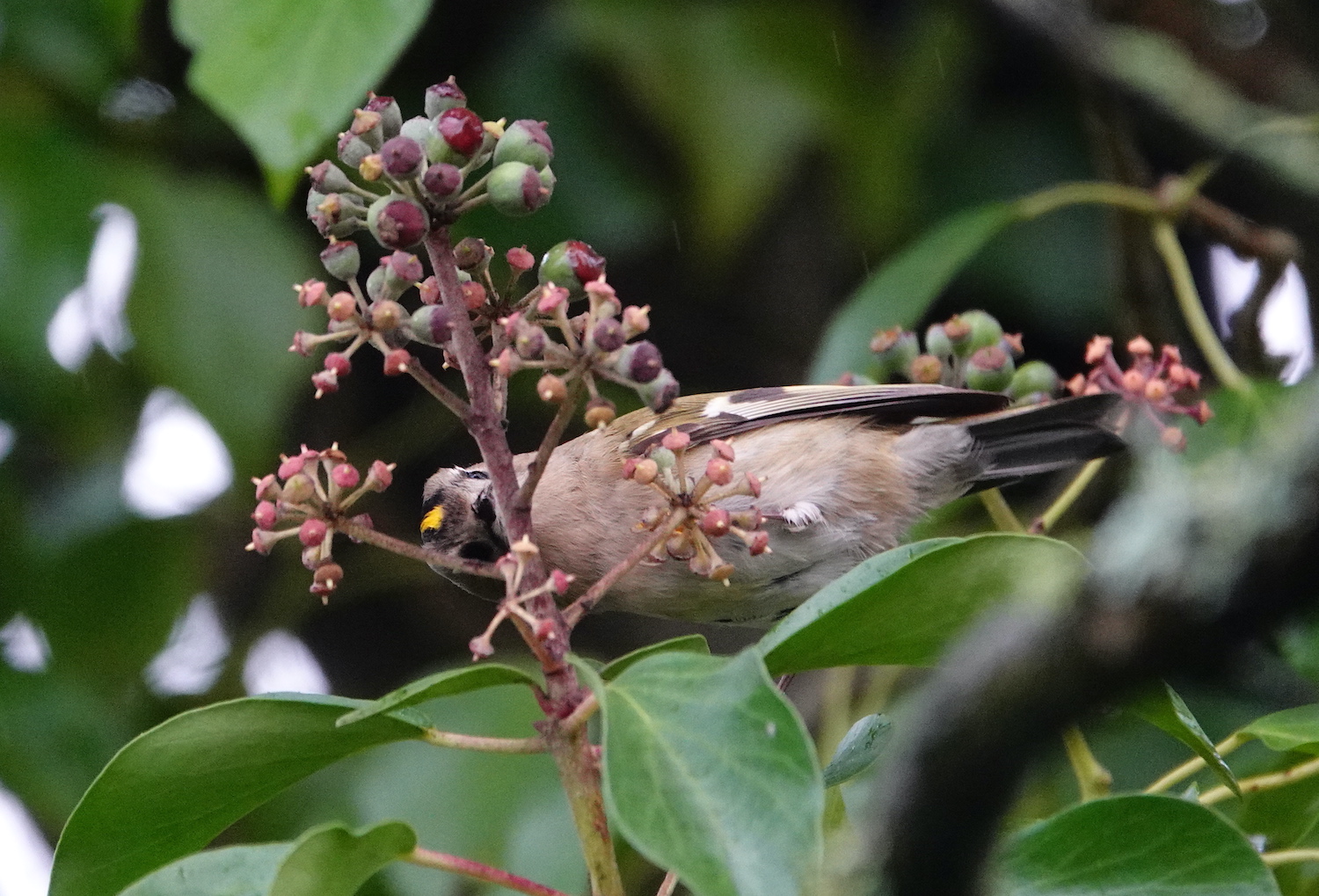 On and off rain made for a wet walk today. All five thrush species were very active feeding on what berries they could find. On W lake a very distant duck was I’m pretty sure the Pochard x Tufted Duck hybrid that keeps reappearing. Cropped as much as poss record shot below. Best of all 2 Goldcrest were feeding in Ivy halfway along the mile road central path. One photo below of them both disappearing! One did eventually feed in one place for a short while, played peekaboo a couple of times then came into the open just long enough for me to grab some shots. I love the orange feet!