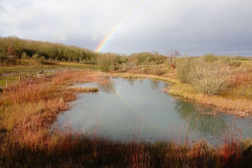 Late morning before the rain. No show by any Hawfinches this morning, although I didn’t linger very long. Couple of Rooks in field beyond far end of W paddock was a year tick. W lake had 1 drake Wigeon and 1 drake Gadwall by the posts and a Common Gull on the posts. Little Grebe was whinnying frequently. There were 40 Pochard – 35 on E lake and 5 on W lake, all drakes exc 5. It was sunny, but dark clouds to the NW had a rainbow which was reflected in the dragonfly pond.