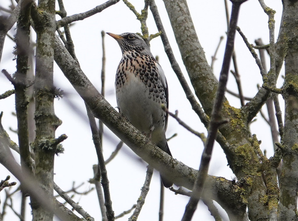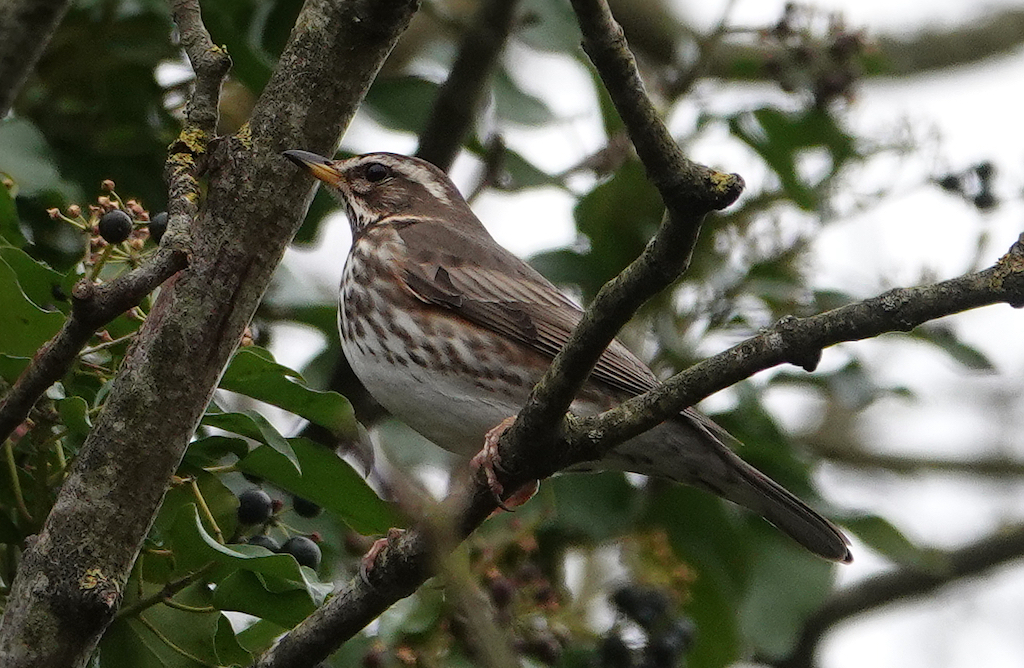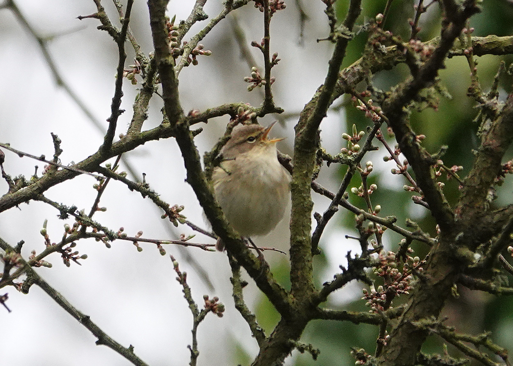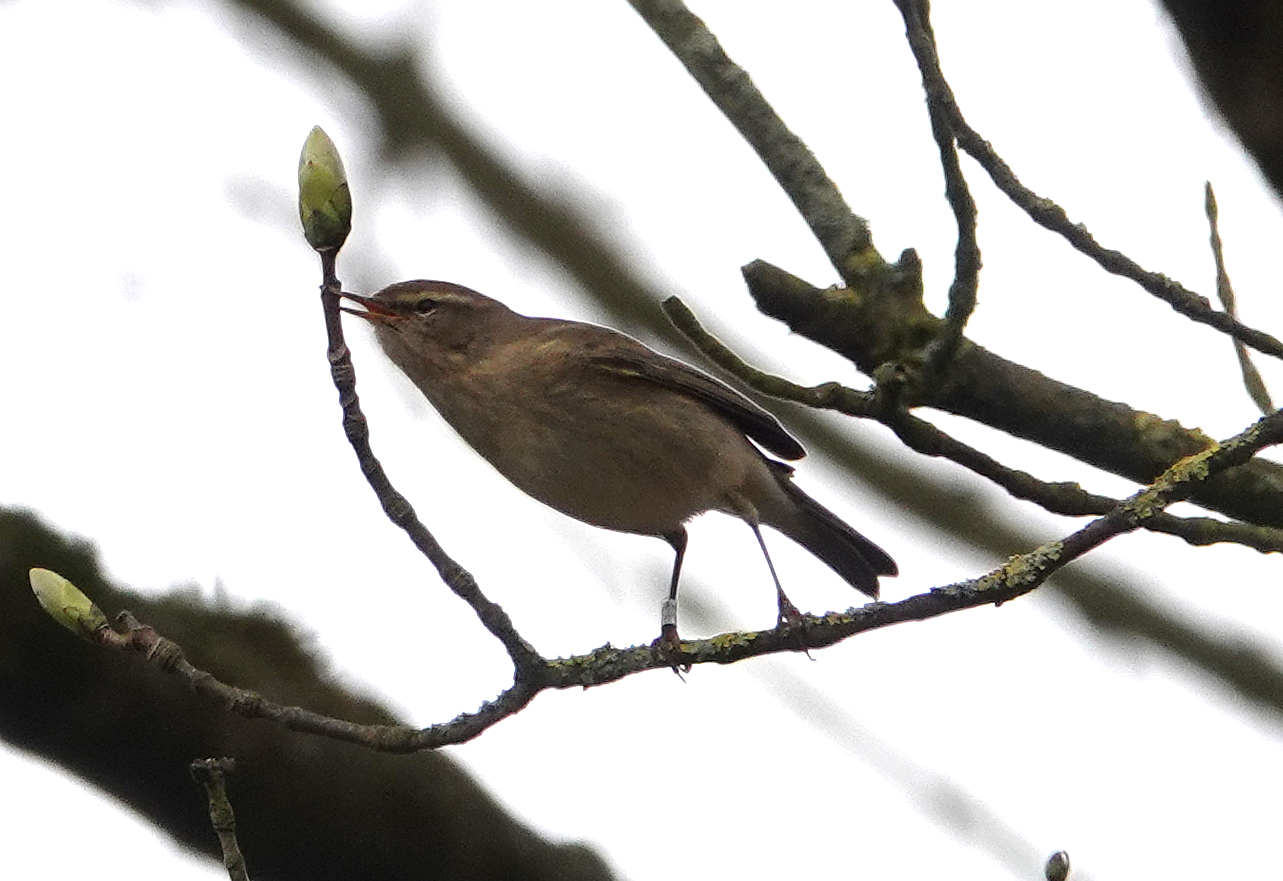 Paid a visit mid to late afternoon, finishing at about 5:30. There were 4 Fieldfare and 2 Redwing feeding on Ivy berries in a tree near the play park. The Redwing were occasionally singing which you don’t often hear. A Phyllosc type warbler appeared briefly and my grabbed shot just as it started to take off, shows it was ringed. I don’t think it’s the Willow Warbler that Graham Smith had found there yesterday tho’. It’s a rubbish photo as it was distant so it’s a huge crop. At around 5 p.m. 30+ Sand Martins suddenly appeared – there had been none in the morning. They flew around until I left. Down near the wooden bridge in the wood on the left a male Blackcap was calling and then burst into song. Also had a a Chiffchaff there singing – again poor pix due to lack of light and sizeable cropping.