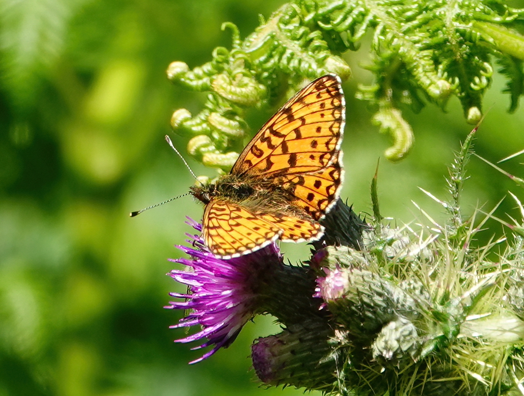 Just myself, Alan Rosney, plus Adrian Webb, Mark Davies & Diane visited on what was going to be a hot day. We got there at 9:30 and birded {and butterflied etc} until about 1 p.m. then headed off home before it got too hot [and busy]. As it was, by the time we headed back down from the top view point both lakes had more human occupants than avian! Considering the time of year we did pretty well with 42 bird species logged. The lower lake had a nesting Coot, and a single Little Grebe stuck to the far margins and whinnied a couple of times. House Martins dropped in to drink, as did a couple of Swifts. Blackcaps, Chiffchaff, Willow Warbler and Chaffinch sang as we walked up by the stream. The the first viewing ‘platform’ area we lucked out and got good viewds of a Small Pearl-bordered Fritillary [Alan’s target for the day -pix below] and we also briefly saw a Dark Green Frit but it didn’t settle. Whilst snacking in the shade at the top viewpoint we had some close fly-by Siskins and in the trees below by the stream was a male Redstart. A Kestrel chased a Buzzard along the ridge, and on the walk back we got on to a singing Garden Warbler which gave reasonable views as it flitted about in the top of a tree. Click here to see the full list pdf.