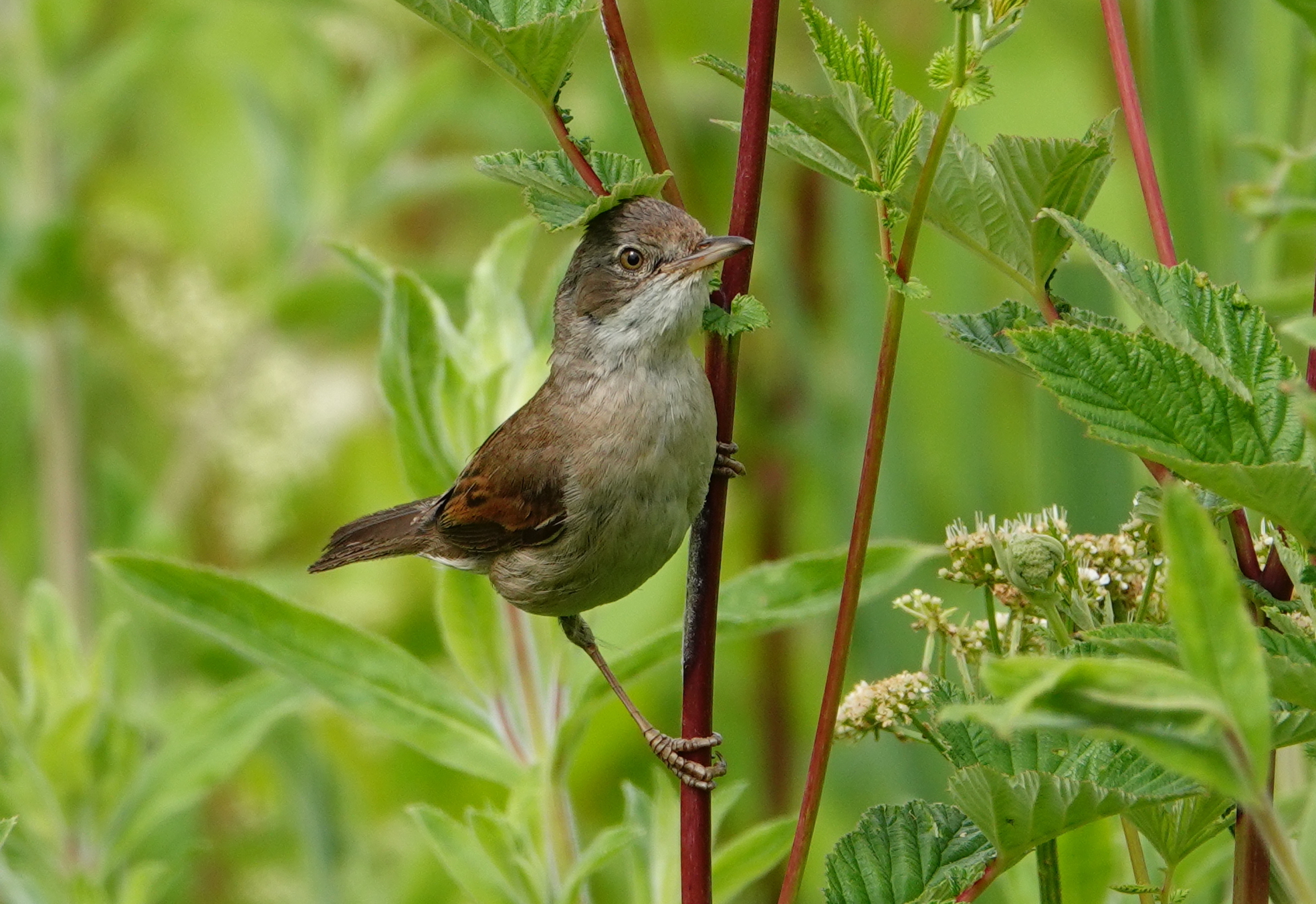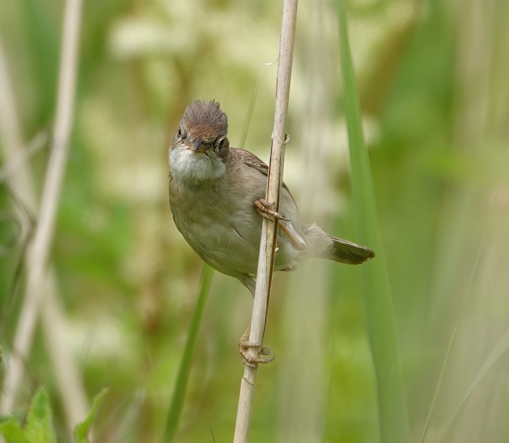 There were 5 or 6 very active and vocal Whitethroats in the vegetation by the dipping pond this morning, a famliy group. A Cetti’s Warbler sang several times at the back of the dipping pond but as usual didn’t show. A pair of GC Grebes were together on the far side of W lake and looked to have 2 or 3 young ‘humbugs’. By the E lake boardwalk there were a couple of Reed Warblers which I just failed to get a shot of.