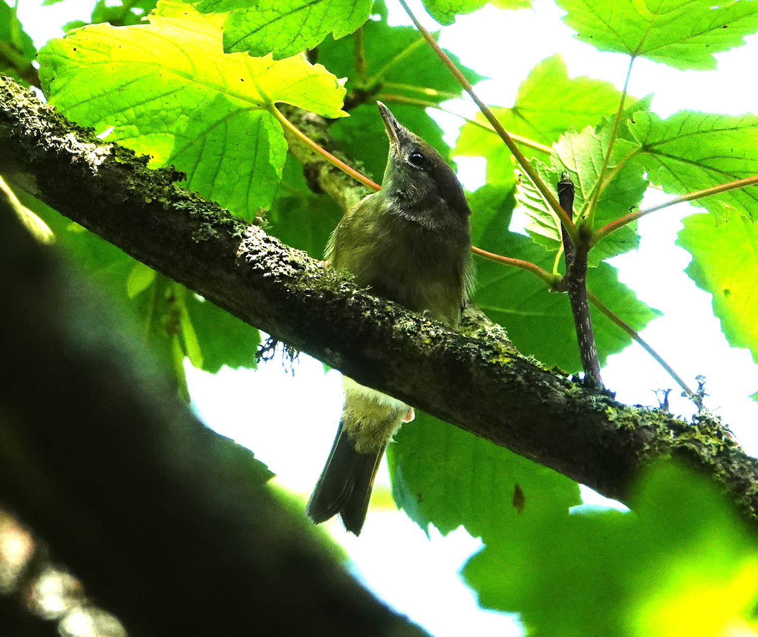 Pretty quiet bird-wise at the moment due mainly to the heat. A group of 9-10 Tufted Ducks have been around for a few days – a sign of autumn – returning non-breeders probably. The half grown Gt Crested Grebes on W lake are pretty vocal but never very close. Had an obliging juv Blackbird in Cogan Wood 2 days ago and a Song Thrush outside. The bird in the tree is a young Blackcap which was v difficult to get a picture of.