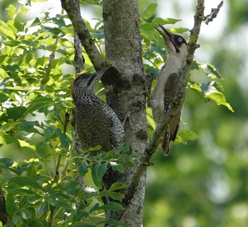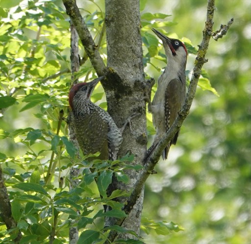 A quick walk round and on entering E paddock I immediately heard some very agitated and loud yaffling from 1 poss 2 Green Woodpeckers. I scanned around and found two on a tree trunk in the wooded area behind the play park. I crept across the paddock and eventually got close enough [they’re normally very nervous], to get some nice cropped stills and I took a couple of video clips using the Sony RX10 IV at max zoom. The birds were an adult male [on the right – red in its ‘moustache’] and a stripey and flecked immature. There’s a link below to a vid clip on Youtube.