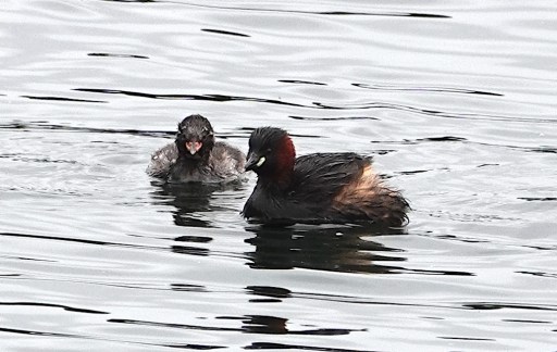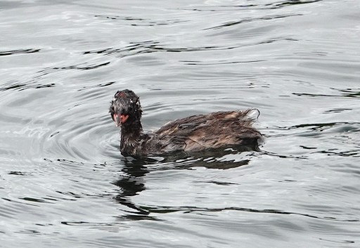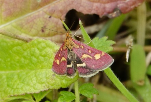 A juv Little Grebe was quite active and vocal, constantly badgering its parent for food, although it could dive itself [see the ‘bedraggled’ image]. In E paddock I had a very brief encounter with a female Pied Flycatcher, which I took to be a chaffinch when it flew past my peripheral vision, due to the white wing flashes, but then it settled in a tree in the ‘ditch’ briefly. I managed a distant shot which I’ve cropped a little, but then it flew off towards the golf course. Green Woodpeckers are evident almost daily. Graham Smith had 3 Spot Flys, a Garden Warbler and a Ring-necked Parakeet somewhere by W paddock. Non-bird highlight was the attractive Pyrausta purpuralis moth and a Common Carder Bee.