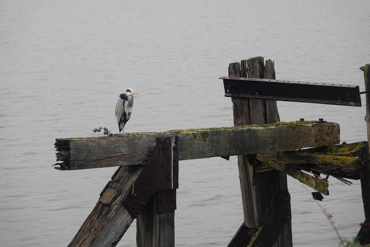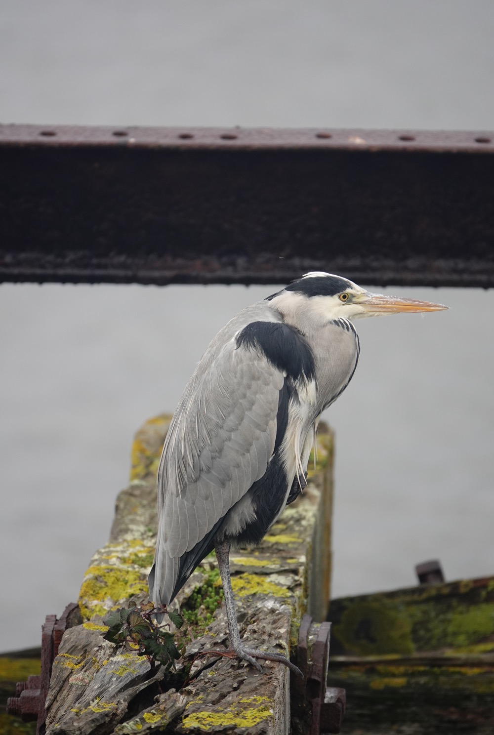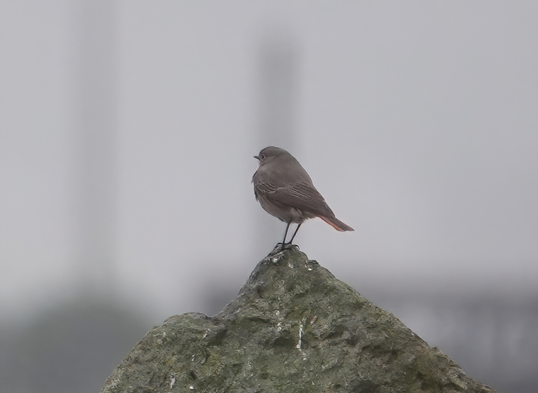 Walked across the barrage in mizzle and headed to Porth Teigr Way to try & see the Black Redstarts [3 of them!] initially found by club member Evan Jones. Conditions & light were awful but on arrival I heard a call and saw one on top of the roofs of the Adventurer’s Quay appartments, which obligingly flew down into the waste ground by Porth Teigr Way and used a large concrete block as its favourite perch. [See map]. The birds commute back & forth between the waste ground and the appartments. On the way back I got some nice shots of a Grey Heron standing on one of the old mooring structures in the Bay, and there were two Ravens foraging along the inner barrage shore.