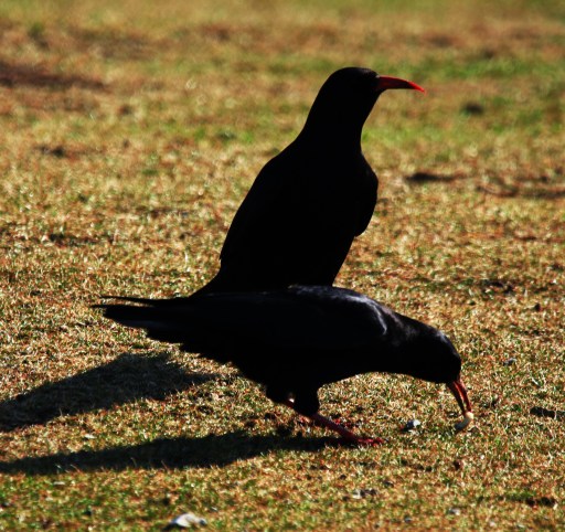 This morning 14 March, pair of Choughs, less then twenty mins walk from Ogmore beach car park, just passed the stone walls, first sun in wrong prosition, as the red of beak and feet hiden. The calls and shape of the beak confirmed Chough but pair happy carried on feeding in the grass allowing me to find ideal prosition, so able have at least fifteen minutes to just watching until a Dog and owner pushed past.