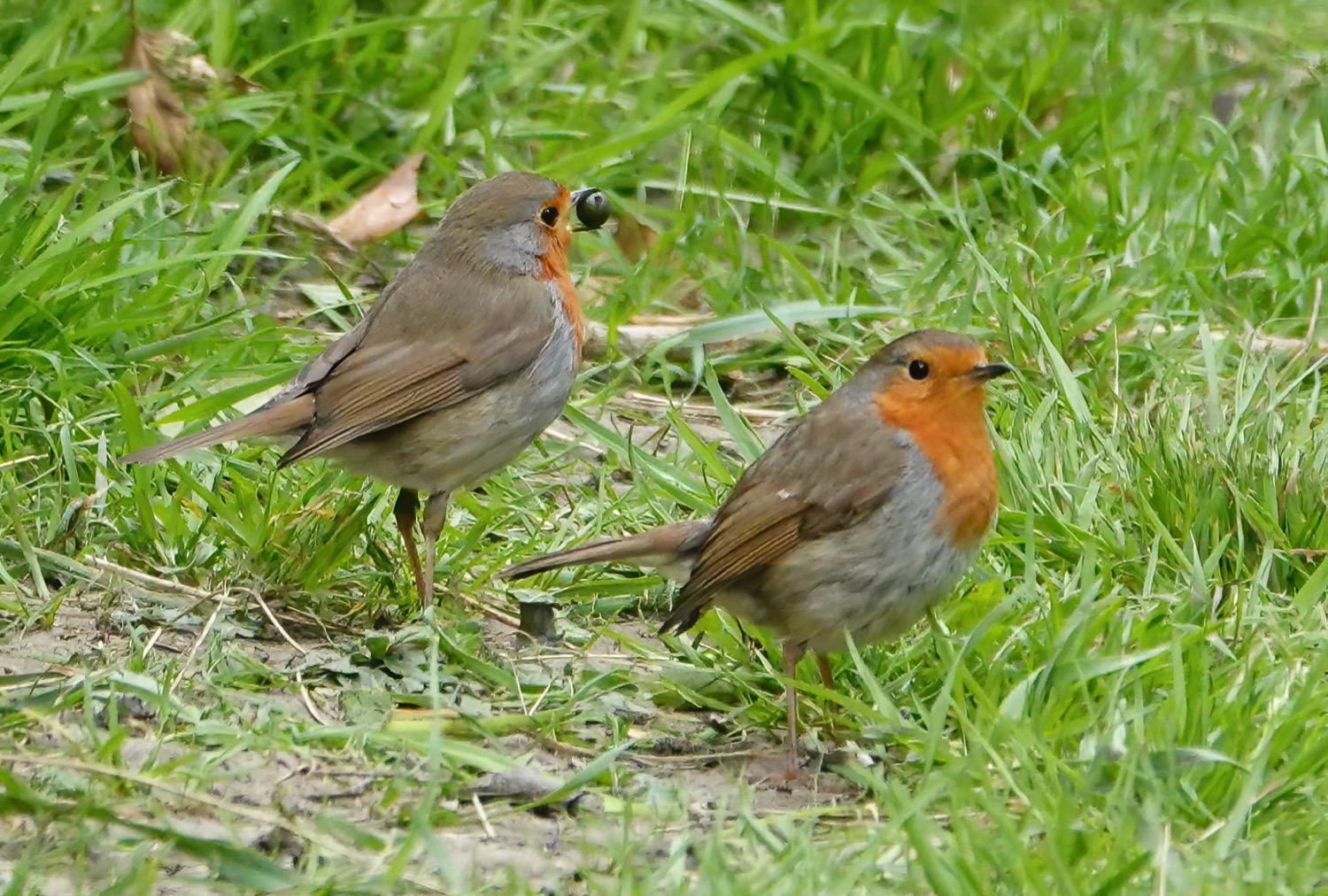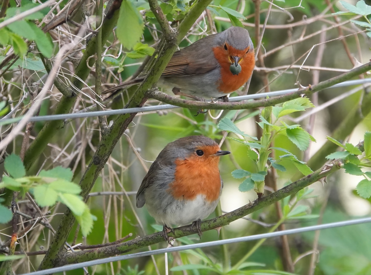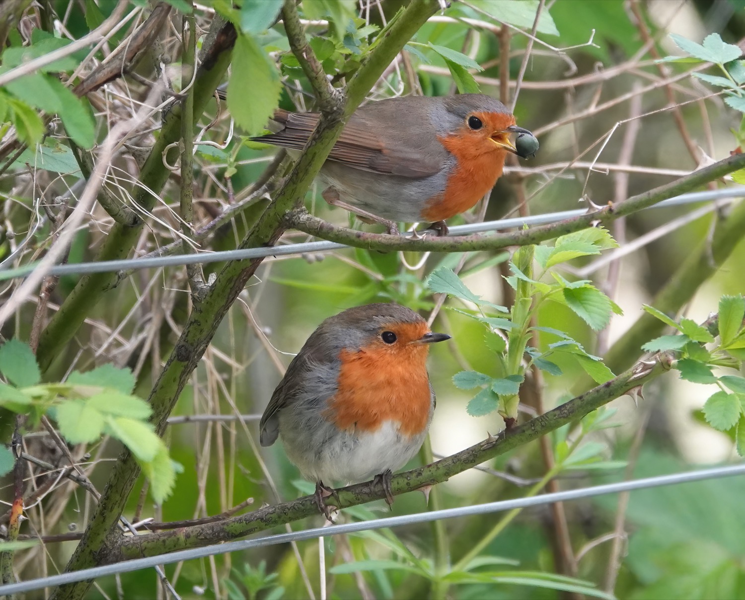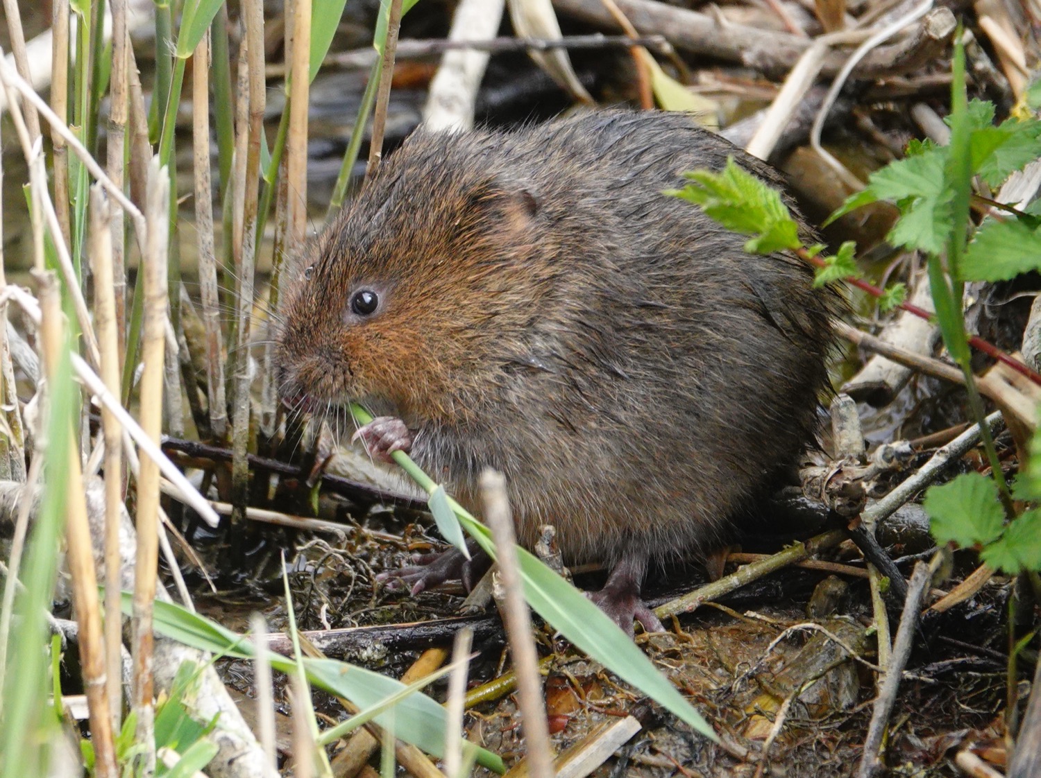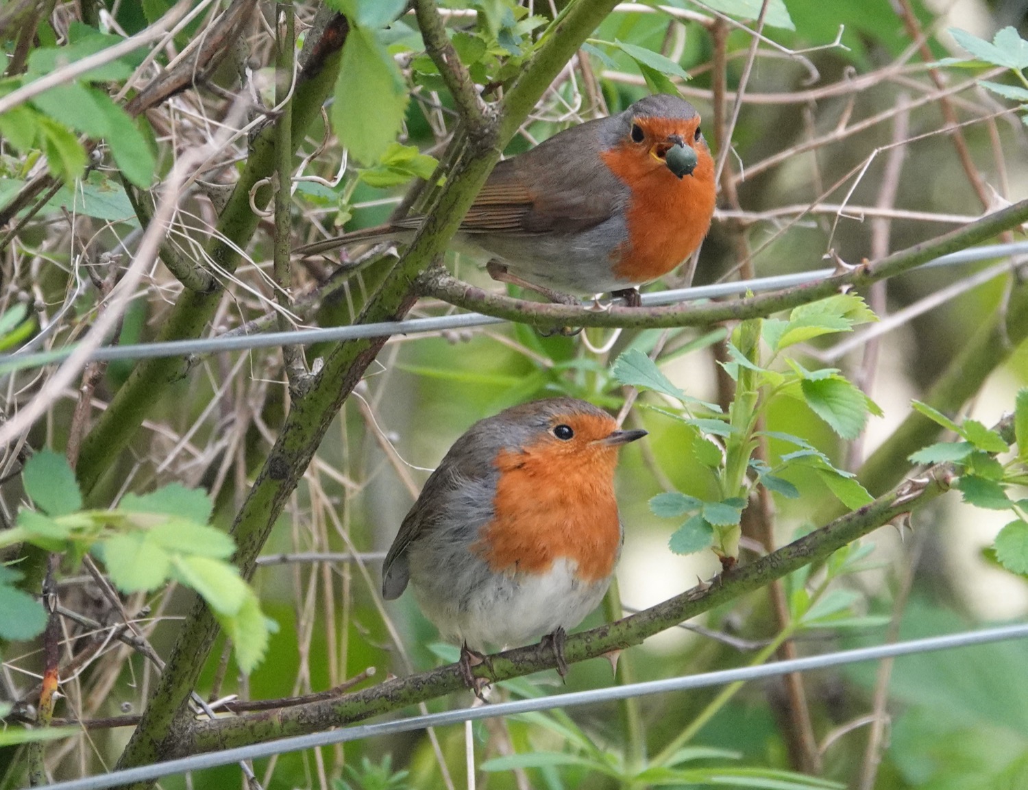 Lesser Whitethroat, Common Whitethroat and Reed Warbler still singing in the same locations at yesterday. Around 10 Swallows were over W lake for a while and a couple of Sand Martins. A Coot with 4 chicks on W lake. The Robin pix below feature a male attempting courtship feeding by offering a berry to a female who wouldn’t take the bait, and the adult Heron was standing on the main E lake boardwalk on a section that has been temporarily closed off while nearby works are taking place. By the same section of boardwalk was the lovely Water Vole.