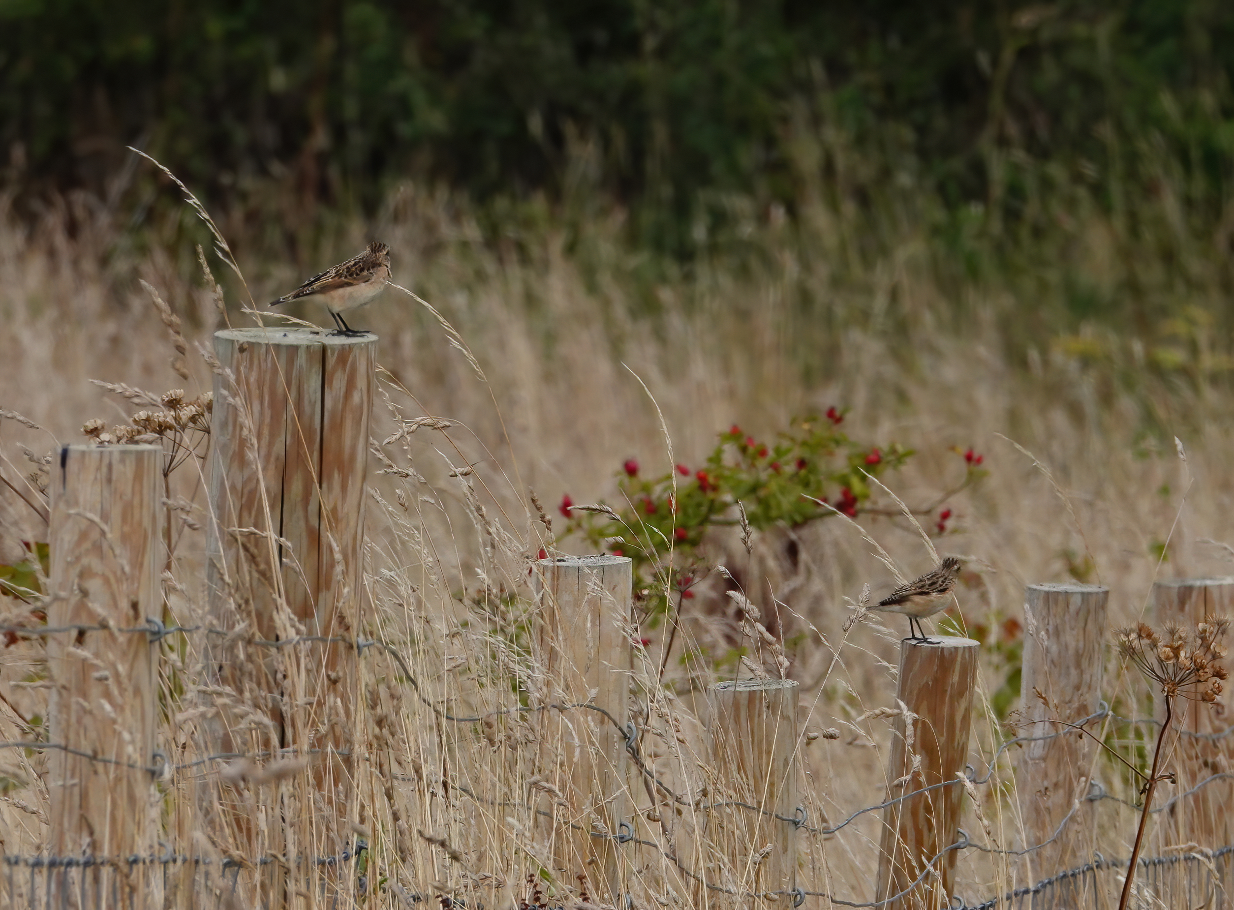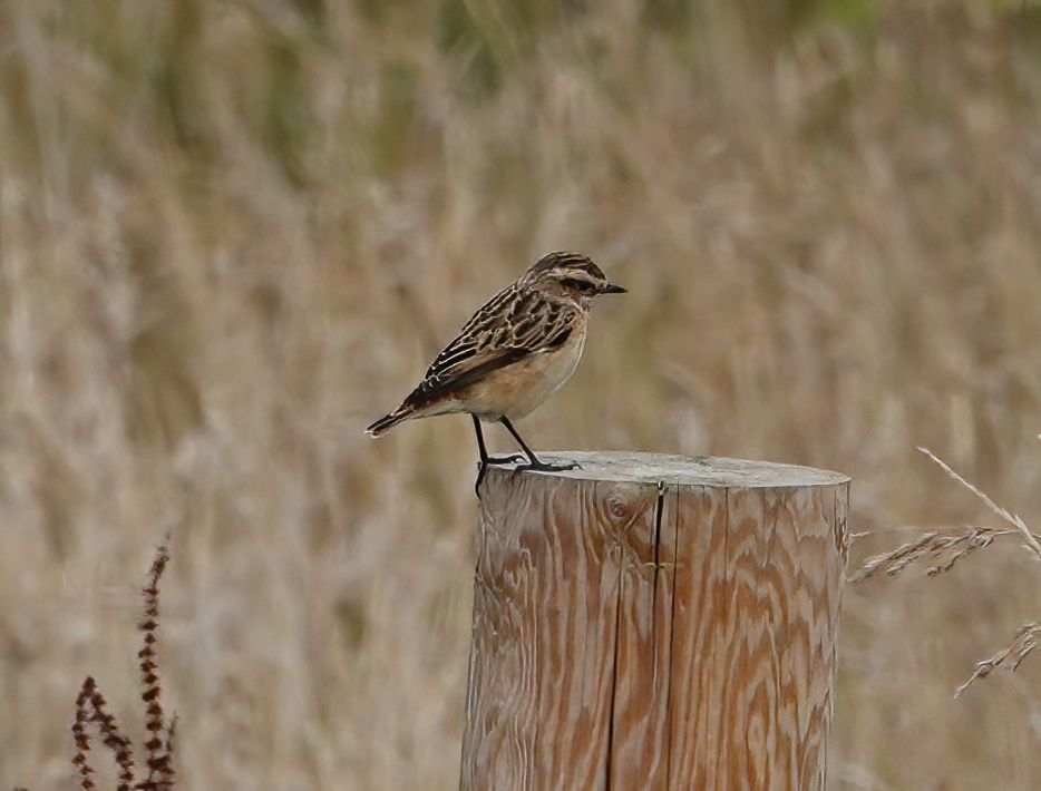 Walked through the upper Dovecote field this morning and around the new tree plantation on the slope above Sully Brook hoping to see some species seen by other observers yesterday whilst I was with the GBC group in Pembrey. Eventually connected with 3 Whinchat using the trees and fence posts as perches. In the scrub area in the middle were 4 Reed Buntings and a male Blackcap. In a patch of what looked like low thistles in the cow grazing field to the west there were 3 Yellow Wagtails which proved quite difficult to see in amongst the vegetation. Overhead a Buzzard mewed, and a few Swallow flew through.