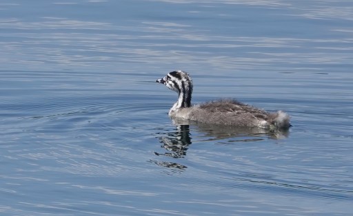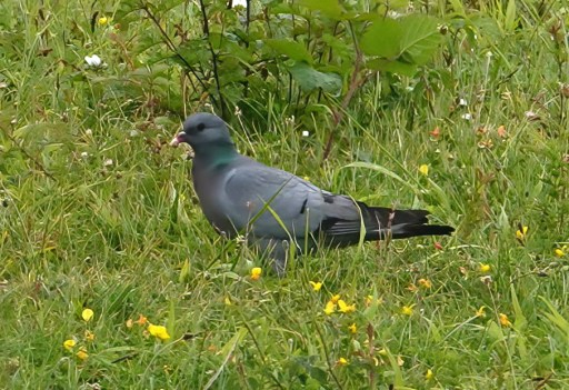 Today was pretty quiet but I noted a Green Woodpecker near the dragonfly pond and a Great Spotted Woodpecker calling by the Mile Road next to W. paddock but not seen. A Chiffchaff was feeding in a tree there and a WIllow Warbler has been singing from a tall bare tree near the snipe enclosure for several days. One Great Crested Grebe pair has a single well grown ‘humbug’ [usually on E lake] and this morning I saw that the other pair have at least 2 small chicks, still being carried on the adult’s back [1 visible in the pic below]. There’s a Moorhen with 3-4 young on the dragonfly pond. Yesterday a Stock Dove was in W paddock then flew obver to feed just beyond the dragonfly pond. Was pleased to see and whole lot of Honey Bees nectaring on the mass of Alexanders near the dipping pond this morning [there’s been a noticeable absence of bees & hoverflies up til now]. Whilst there I saw a Reed Warbler singing in the ‘open’ amongst the Alexanders and took a couple of shots for the record [see the pix to see the difficulty through swaying vegetation]!
