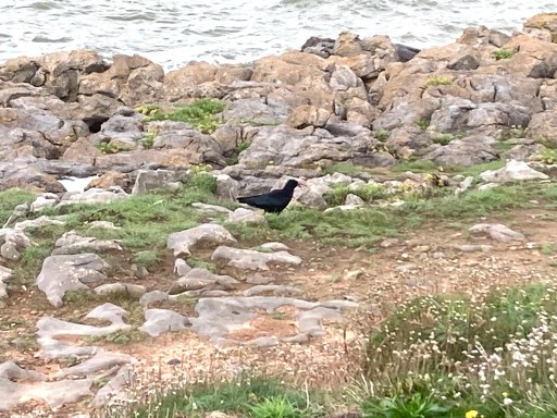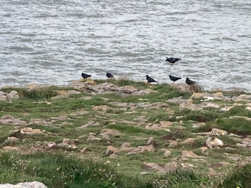 A group of 6 Choughs on Locks Common this morning. The last time I saw them here was also after a big storm. Perhaps the salt spray brings up worms in the turf near the sea? They were busy pecking away at the turf, and the local crows were trying to drive them off. Also a Kestrel hovering.