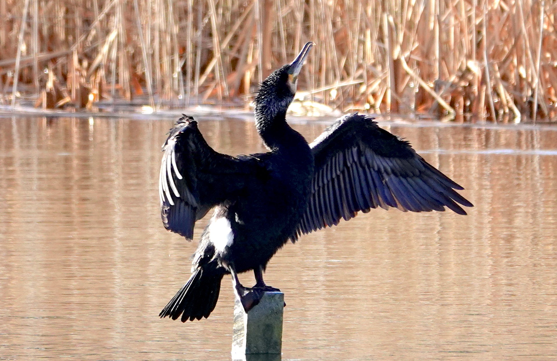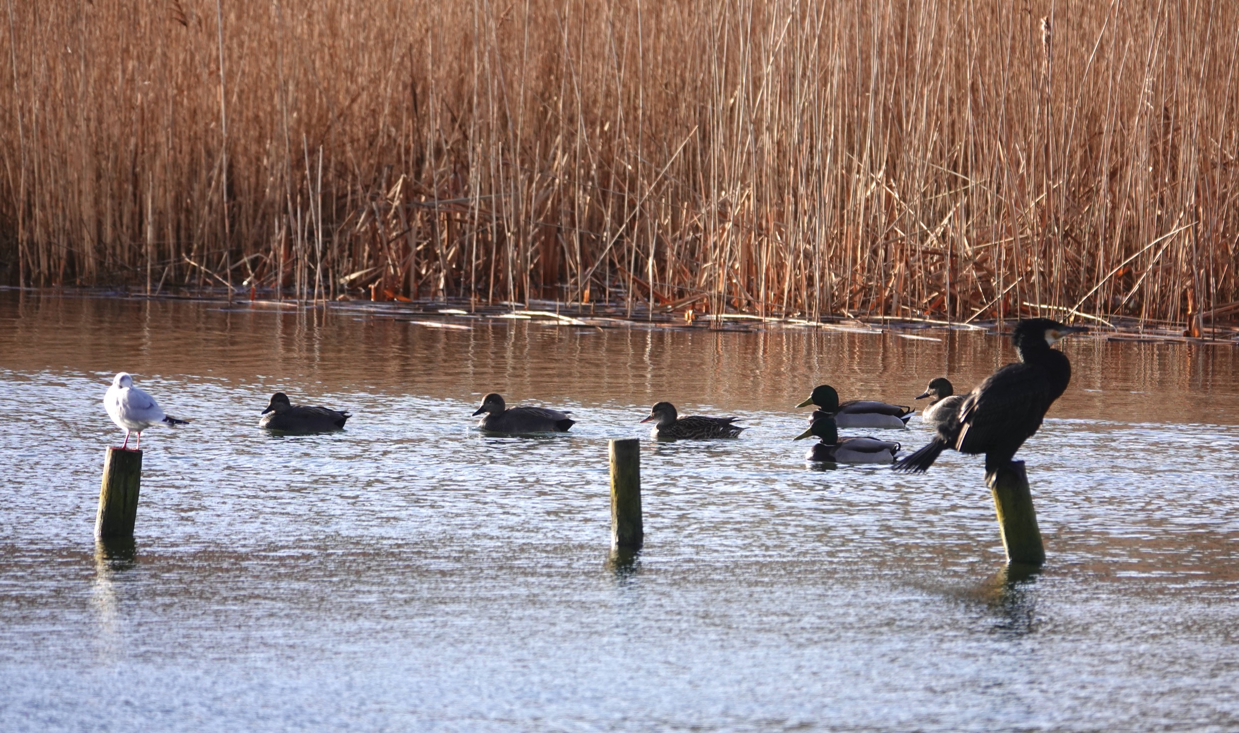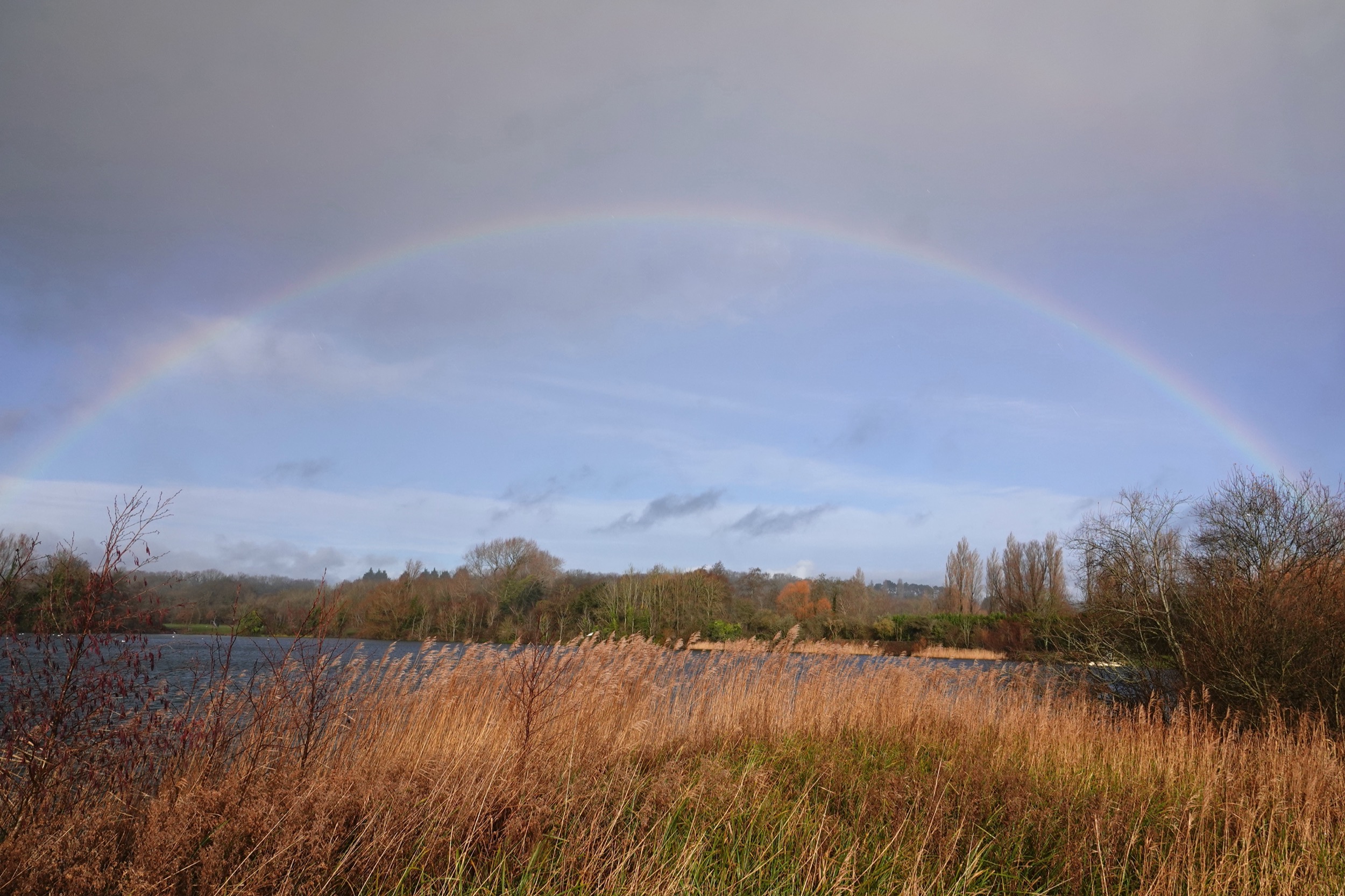 Just a quick visit this morning, dodging a nasty shower at one point. First bird on arrival was a male Great Spotted Woodpecker atop a tree behind the dipping pond. A Cetti’s Warbler gave a quick burst there too. There were 24 Tufties on E lake and 8 on W lake, plus 4 Gadwall near the posts [visible in omne of the pix below]. The W lake posts had 3 smart aduilt Cormorants all sporting their white thigh patch. One was partiularly white headed but I’m not claiming it as a full sinensis.! I just scanned W paddock from the gate and the only bird on the deck was a male Pheasant by the hedge, and whilst I was watching that, a female Sparrowhawk shot across from left to right. A sharp shower as I returned to the cafe produced a full rainbow.