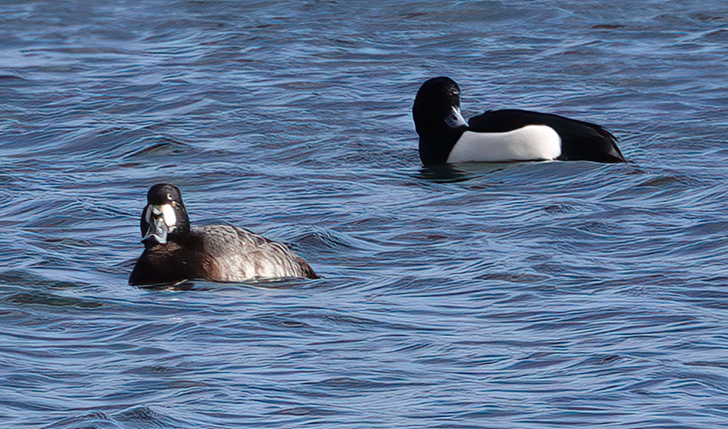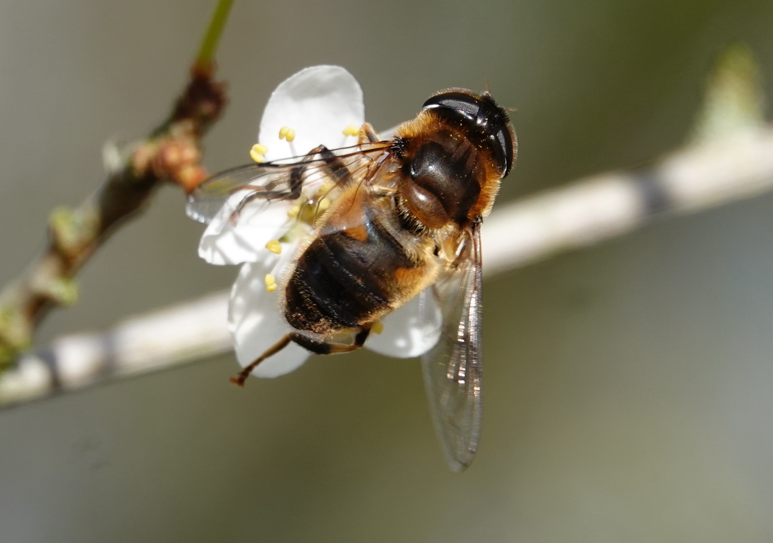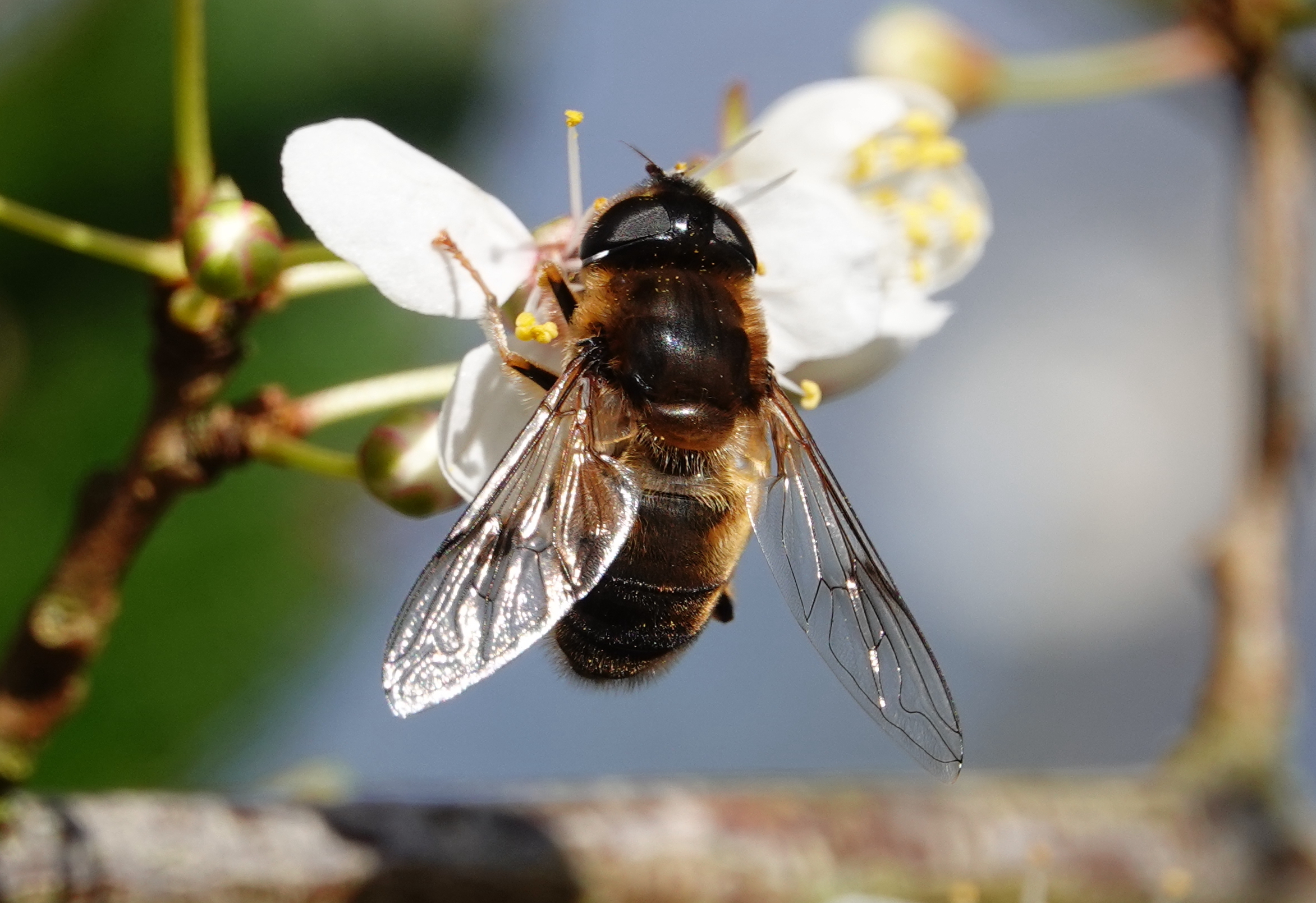 A walk round E. and W. lakes at Cosmeston this morning to avoid the extremely muddy paddocks. The female Scaup was still present on E. lake and was more active than yesterday when she was asleep all the time, plus I had my camera today. The Great Crested Grebes are displaying most days. Of other interest, on blossom at the back of W lake I had my first hoverfly of the year, so I’ll have to start tuning in to those again. I think this one was the ‘Common Drone Fly’ i.e. Eristalis tenax [fingers crossed]. The last pic is of a distant lone Buzzard keeping an eye on the plantation.