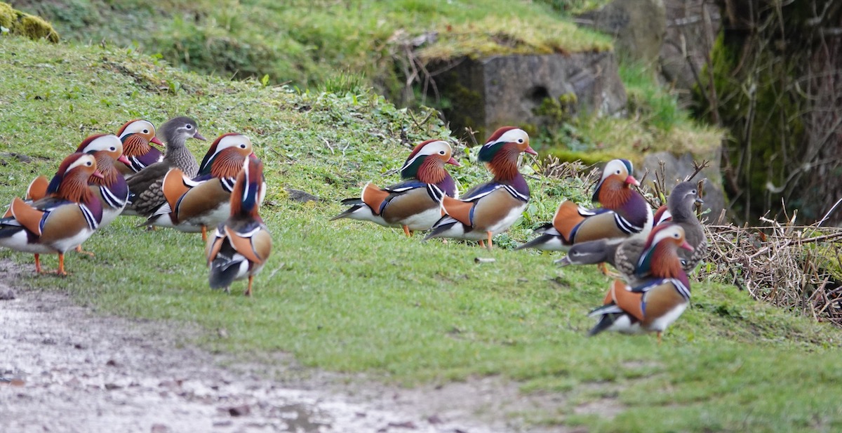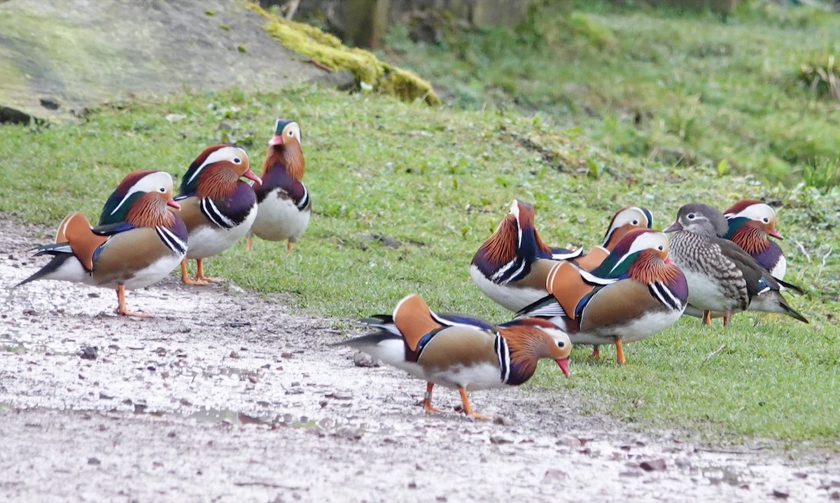 We had a big turnout for the trip to the Forest of Dean yesterday – 19 folk. A dull, still, but thankfully dry day. Sadly we ‘dipped’ on the key species – Goshawk and Hawfinch … and the mythical Lesser Spotted Woodpecker! Even so we logged 41 species. Stars of the show were the Mandarins at Cannop Ponds – see the photos. There were around 20 by the stone works, a large group of them on the grass by the lake. One cheeky male was up on the fence below the bird feeder, picking off the spillages! I did have a pic of that but it was pretty poor so it was binned.