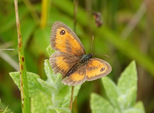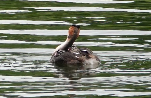 There were c.30 Canada Geese by E lake shore today, presumably having arrived early this morning as they weren’t there yesterday. A Kingfisher flew under the main bridge and disappeared into the trees along the edge of the W lake reed bed. A pair of GC Grebes were with 3 small humbugs there – see photo. Also of note – good numbers of Gatekeepers and a few Common Blues