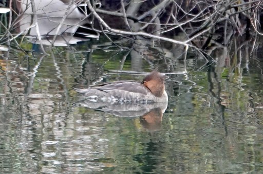 The long-staying [since 19th Nov] female Red-breasted Merganser was quite active at Cosmeston this morning, as opposed to yesterday when it was fast asleep [see one of the photos]. This morning it was fishing on E. lake, in the company of a Little Grebe at one point. Also, on W. lake there were 4 drake and 1 fem Pochard, and a lone Wigeon.