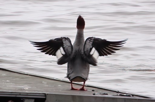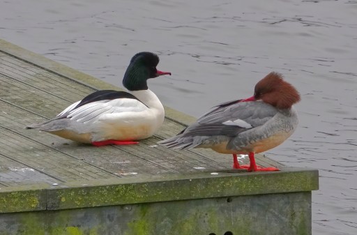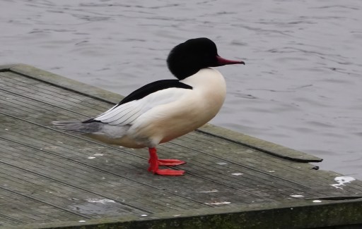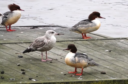 I dropped down to the Bay on Weds to try & see the pair of Scaup only to find they had absconded! Wandering round to the Prospect Place area it was nice to see 7 Goosander [6 fems and 1 male]. A few of then hopped up onto the floating pontoon there to rest & preen – and have a go at some of the gulls already in residence! The male was particularly smart. it was rather alarming to see a Herring Gull flying around with a blue streamer of rubbish – it flew quite freely but there’s always the danger of getting it tangled when it lands.