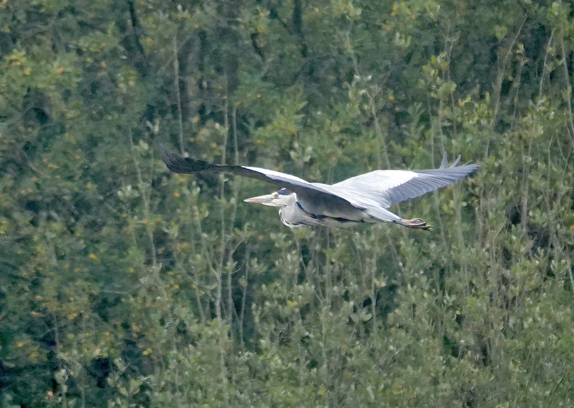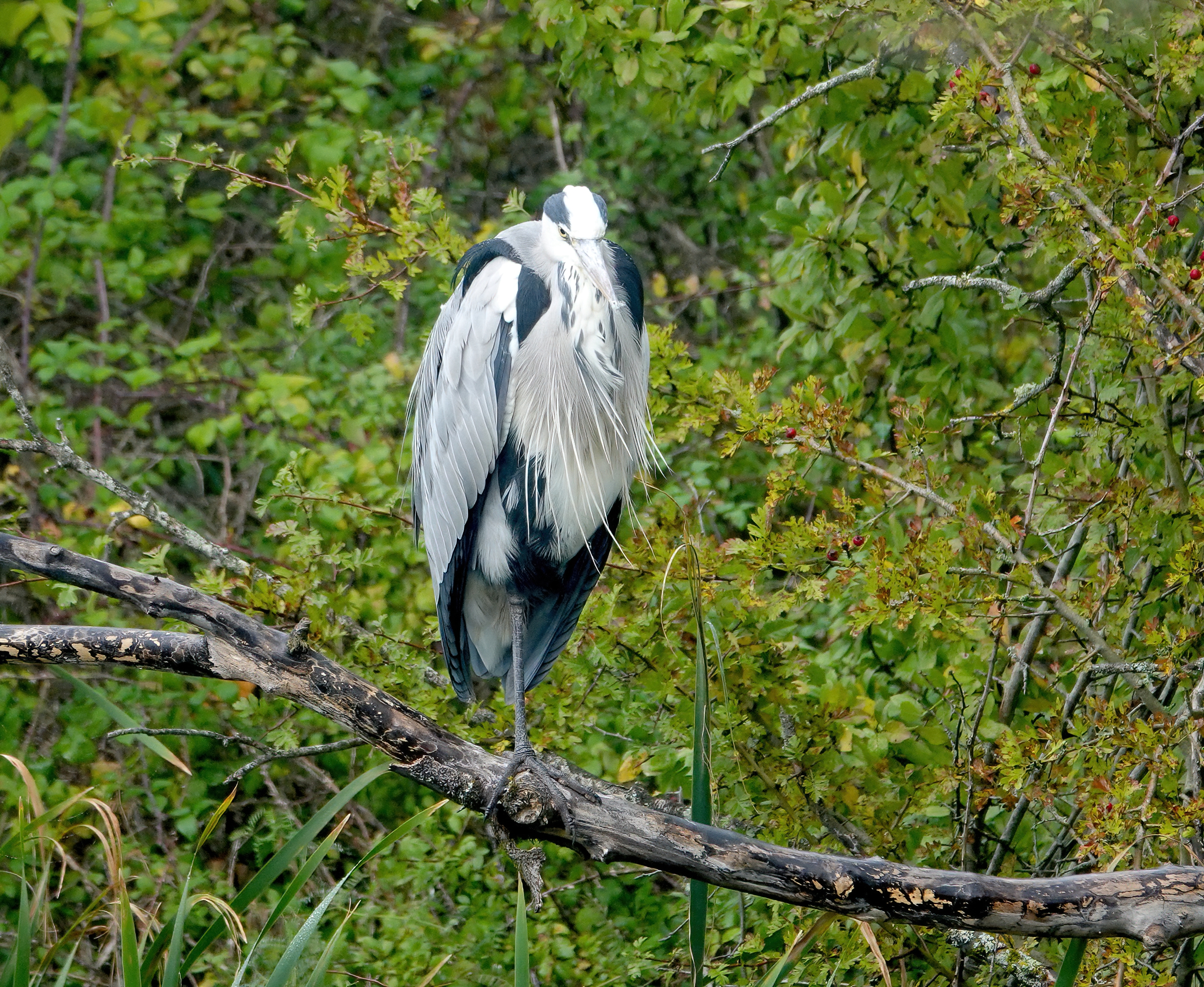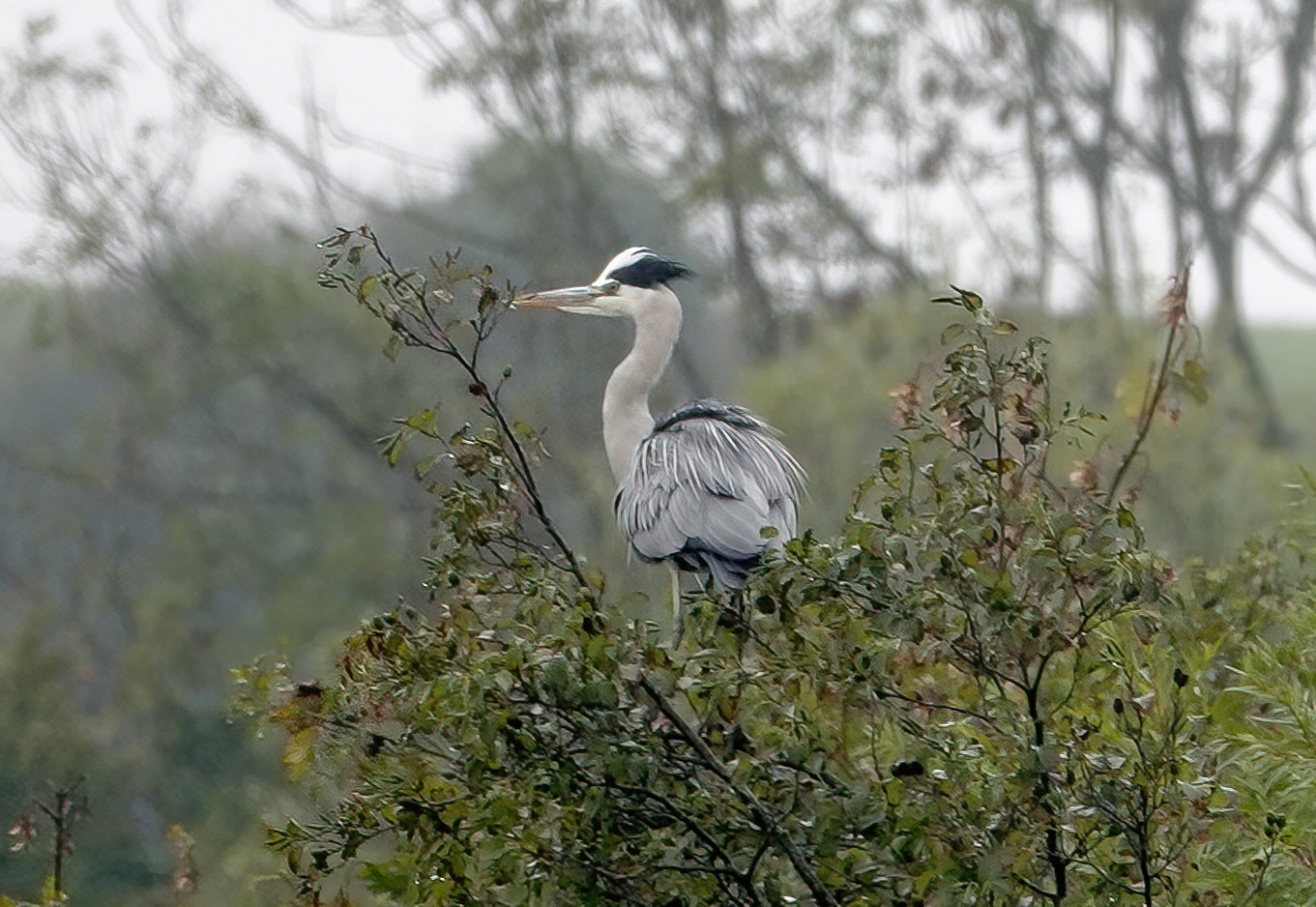 Nothing exciting around, and i got caught in the unexpected heavy drizzle!. Had a Great Tit feeding from my hand by the Medieval Village. A Heron was sitting rather dejectedly in the drizzle in the favoured tree near the main bridge. A dog exploring the trees there flushed it and it flew & landed on a tree on the conservation ‘island’. It was an adult with some impressive plumes. What I assume was a pair of Little Grebes were together on E lake near the shore.