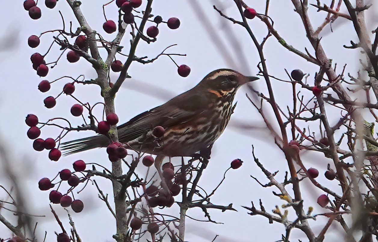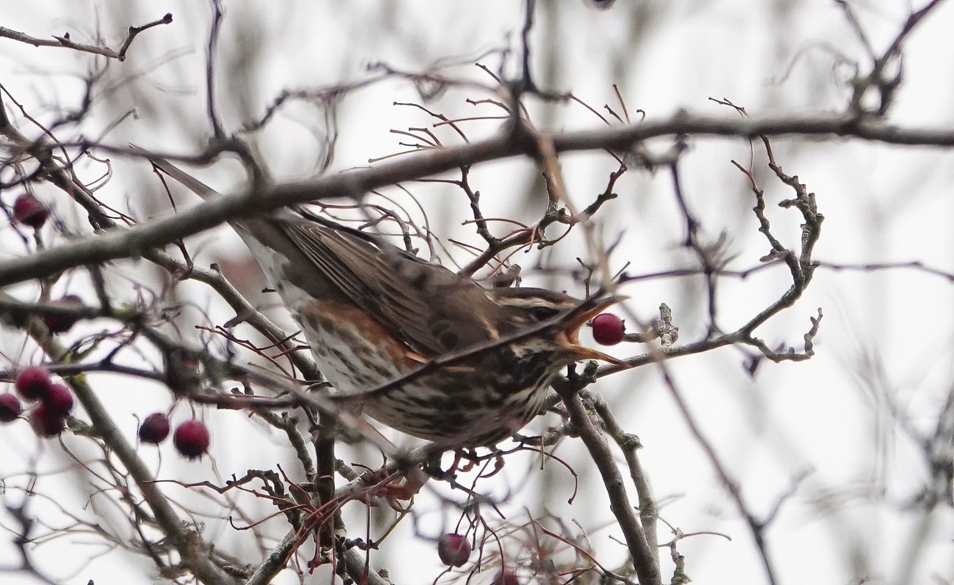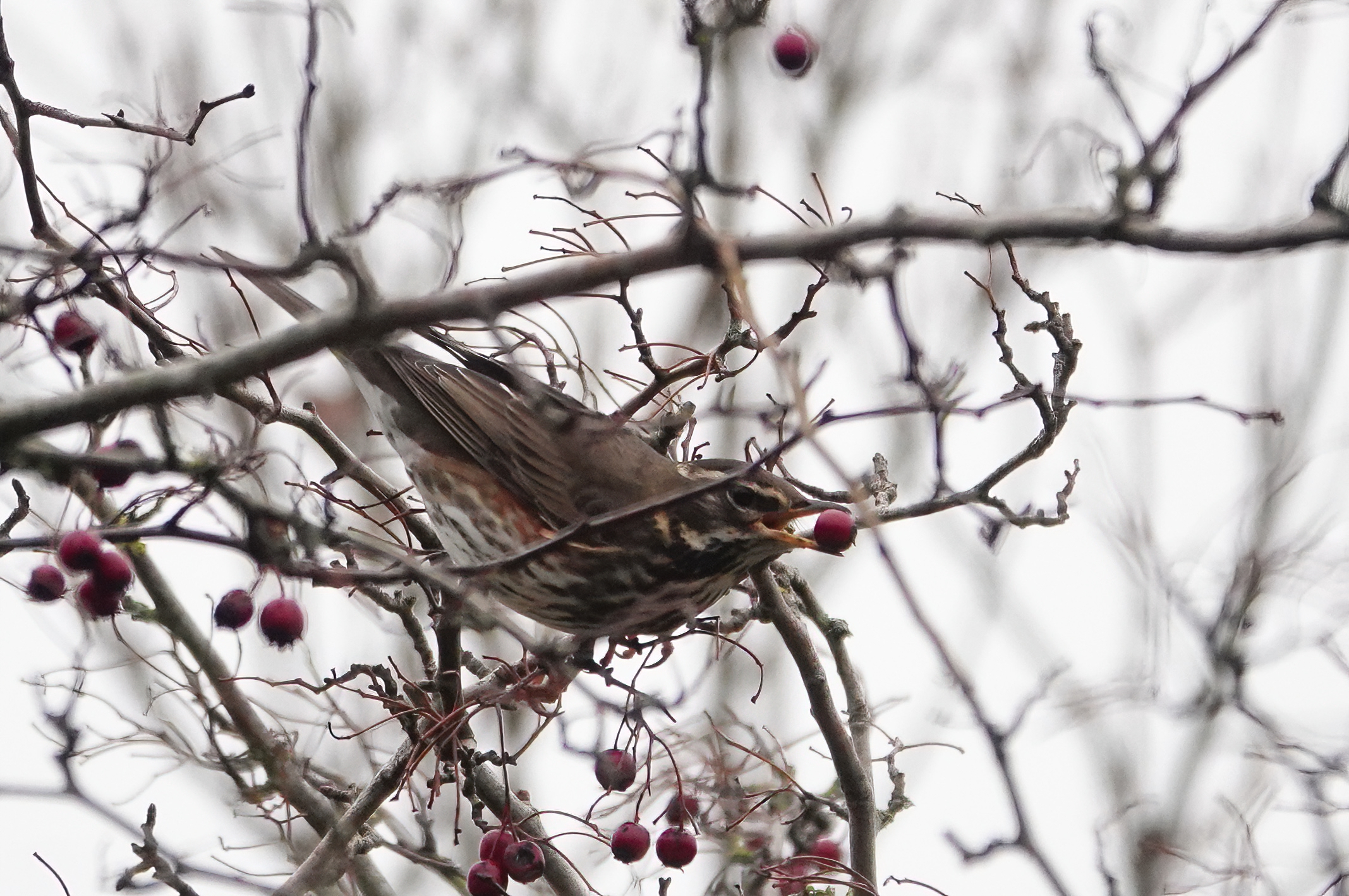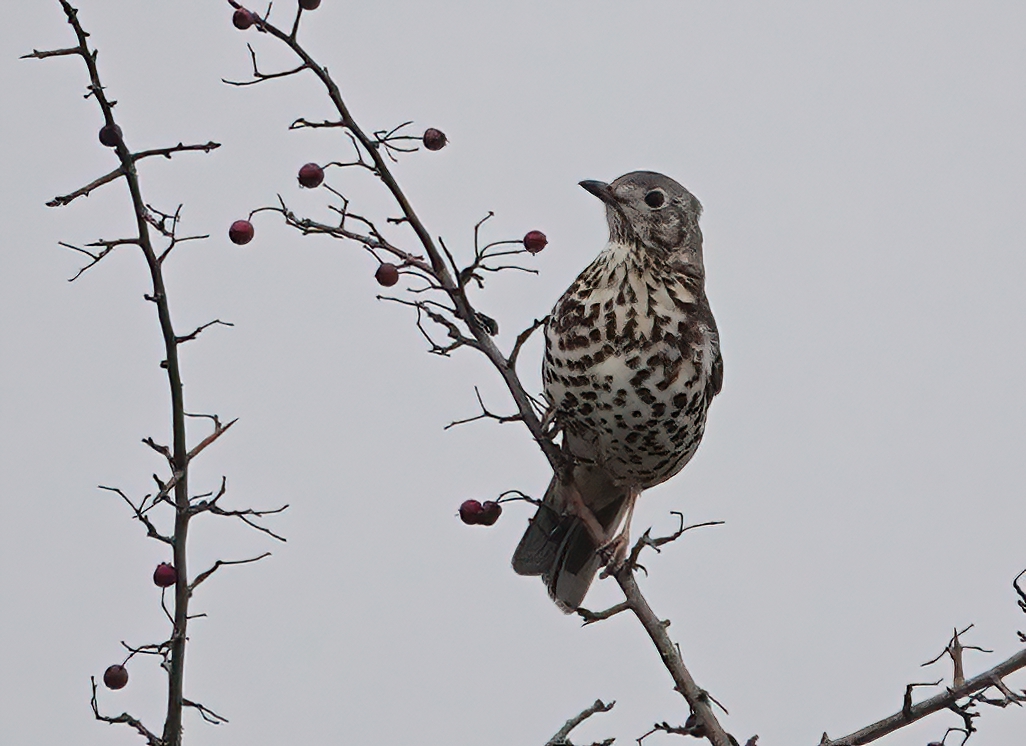 A random collection with a thrushy bias, from a chilly saunter round Cosmeston this morning. In addition to the birds in the pix, there were 4 Gadwall on W lake and a pair of Pochard with the 100 or so Tufties on E lake at the golf course end, sheltering from the cold wind. I’m pretty sure the gull is an adult Yellow-legged Gull. The photo is a huge crop as it was right in the middle of E lake. The warm grey upper parts and v clean head are pointers for me. To left is Fieldfare, top right is Mistle Thrush.