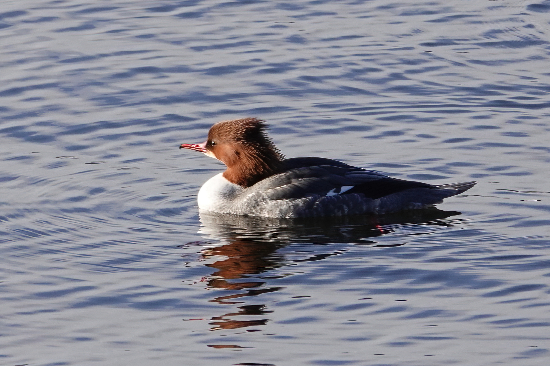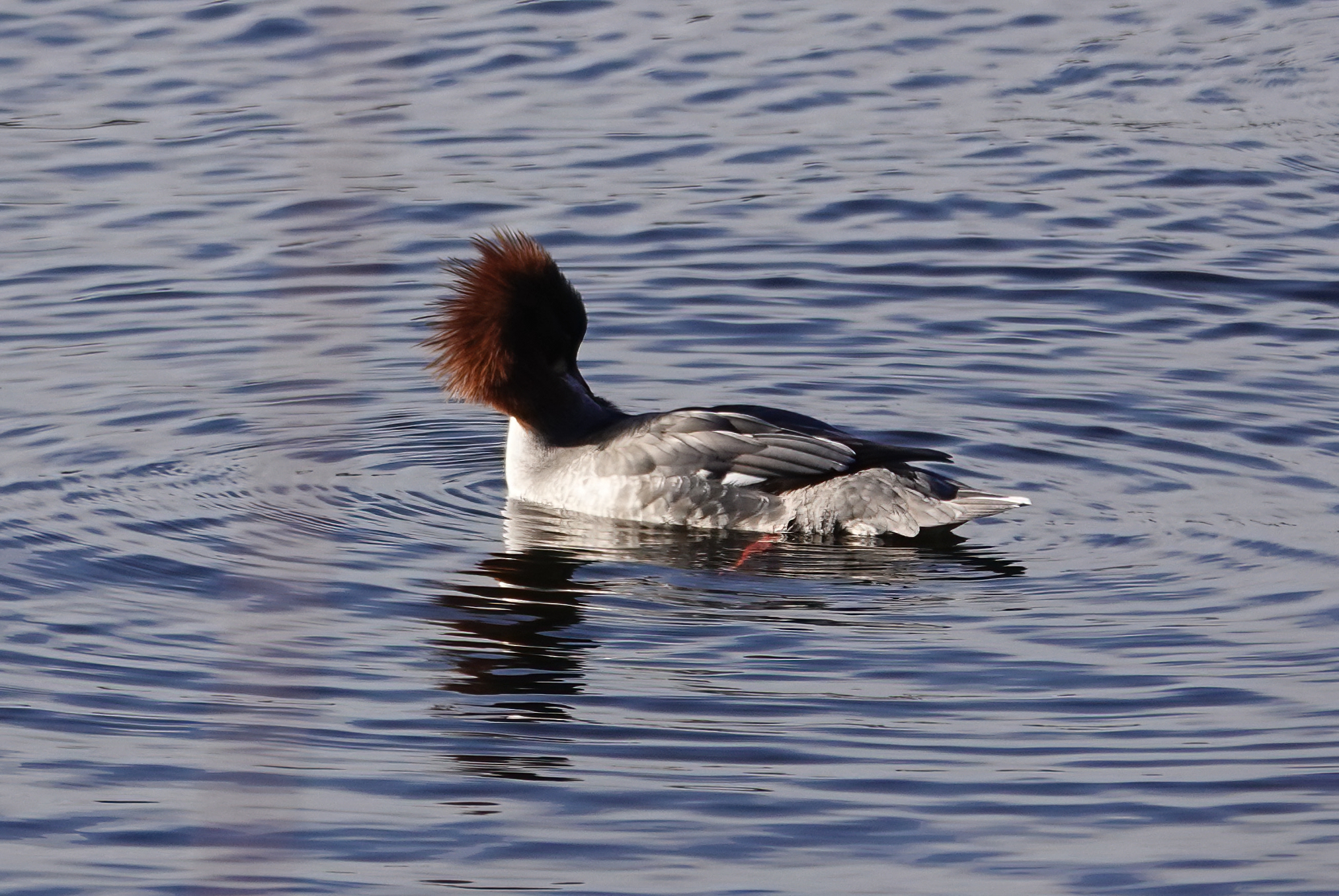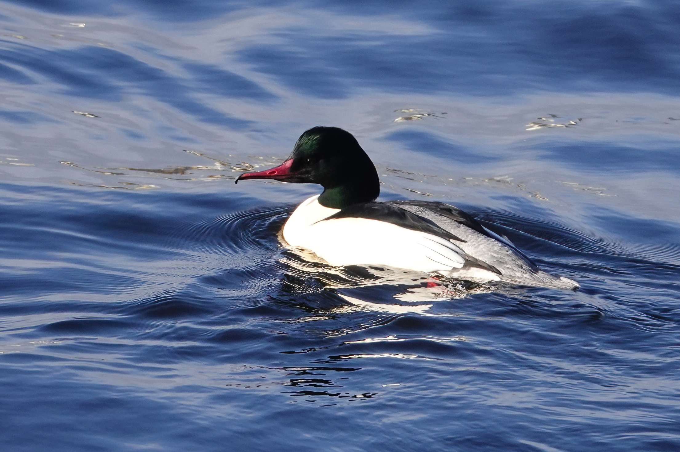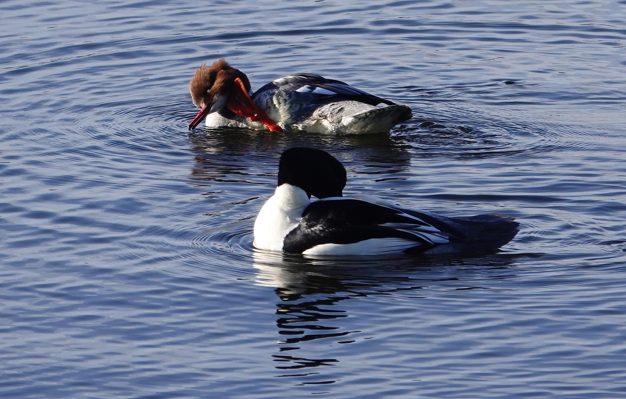 Beautiful day for a full Cardiff Bay Trail circuit, although the 10 km seemed a lot further than when we last did it! Goosander were out in force – I reckon 21 in all – 3f and 1m from the barrage, 2m 1f near the swift tower, 8 [3m and 5f] by the old dock [where the Sand Martins breed], a pair aty Prospect Place and 3f and 1m on the R. Ely by Penarth. There were 70 Cormorant lined up along the inner barrage jetty, 1 Rock Pipit on the barrage rocks and a couple of Redshank and Turnstone by the R. Ely embankment.