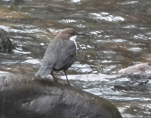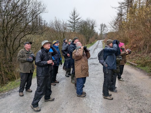 17 hardy souls braved the damp conditions at Garwnant this morning and were rewarded with views of the main target, Willow Tit, before we’d even left the car park! We were accompanied for a while by Ai-lin Kee – she is a ranger there and also a member of GBC and we are very grateful to her for helping to organise our visit. Despite the continuous light rain we saw 26 species including Dipper, and some Snipe on a grassy island on Llwyn-on Reservoir. Hot drinks & snacks in the cafe afterwards were most welcome!. The group in the pic are looking for a Mistle Thrush that had just landed in a tall tree.