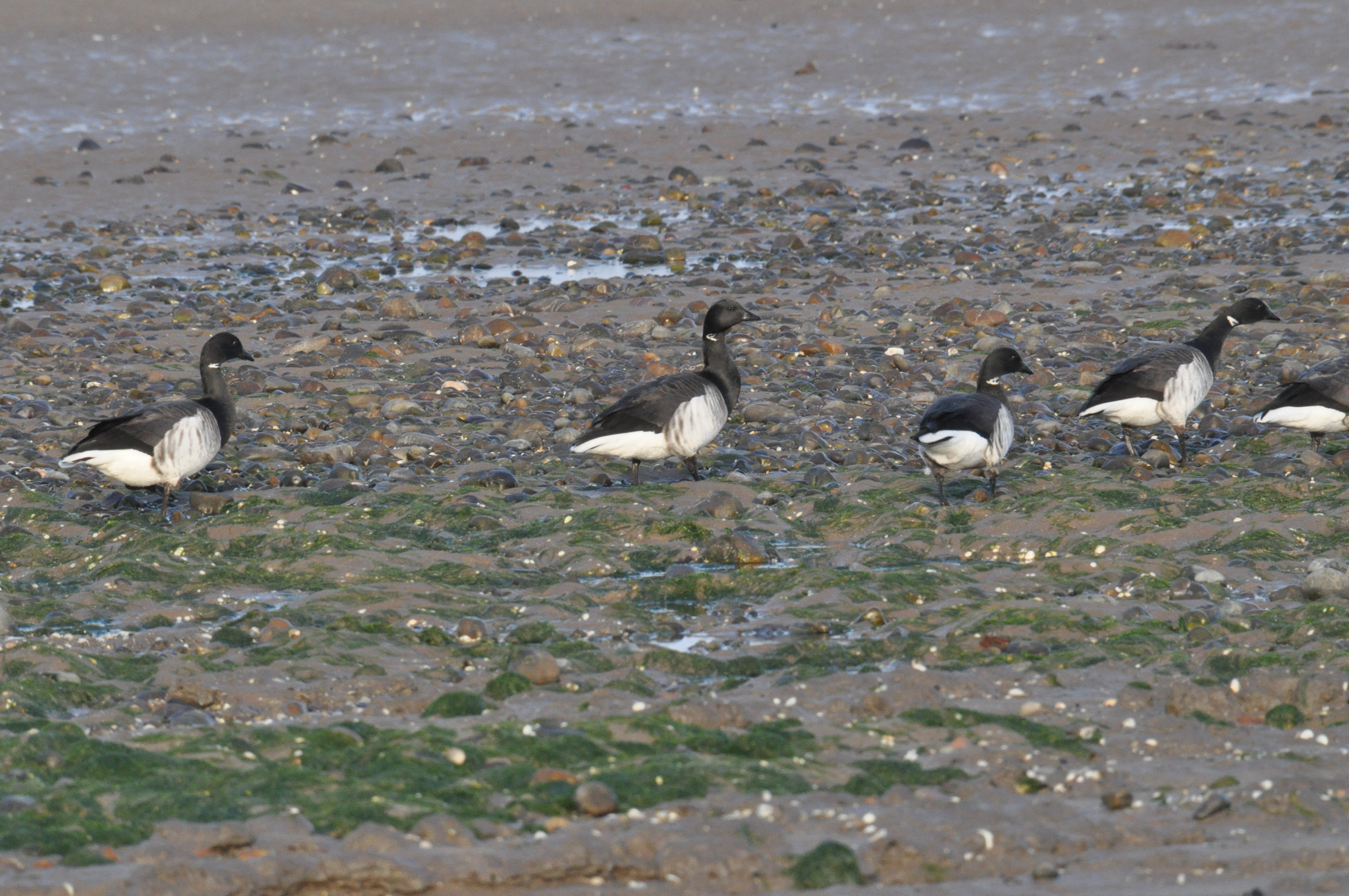 The bay was again quiet apart from 3 distant flying RT diver. Only several common scoter on the water. 6 grey geese sp. fly by the cliffs and out toward the worm, before being joined by 2 cormorant( approx same size) , and then came back in and headed east along the coast. Through the bins, caught a couple of the birds whose bills looked smallish and relatively dark. Not big orange hooter of grey lag. I haven’t got much detail of upper parts , only at distance going toward sun. They only called a couple of times, not the harsh honk of grey lag, so on probability, prob grey lag seen awkwardly, but may? Be pink foots.