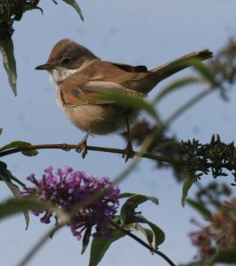 Whitethroat in garden at Clydach,Swansea. It was only last week that I had my first garden record in thirty years here.Very difficult to track in the vegetation but it did offer nice views when it came out to feed.No doubt fattening up for migration