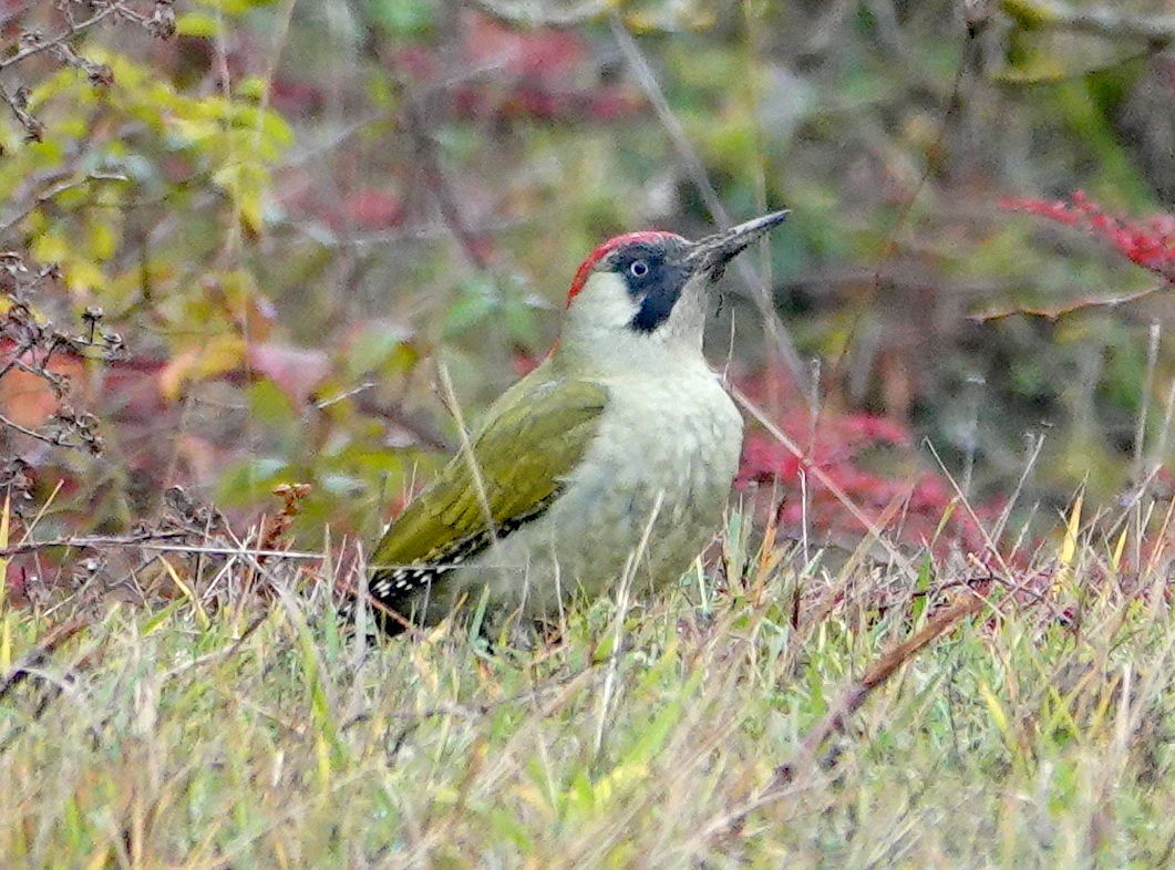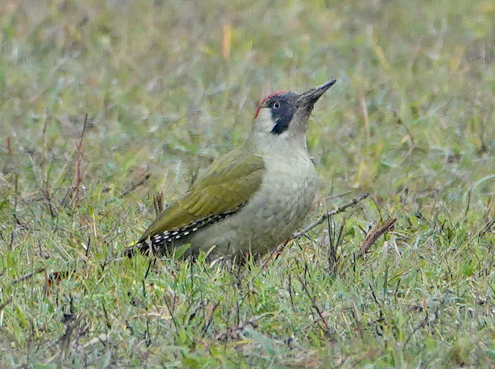 Yesterday there were 2 pairs of Gadwall on E lake, but not seen today. There were also c.50 Tufties recently but now only a few remain. Wayne Strong had 3 Wigeon this morning but they weren’t showing when I was there at around 11:45, but poss skulking in the W lake reeds? A Gadwall appeared to be ‘walking in water’ in the W lake bay [actually standing on a part submerged one of the posts]. Mowing of W paddock was in progress and a few Redwing and Fieldfare were watching from trees lining ther Mile Road, presumably waiting to drop down to snaffle disturbed worms etc. In a finished area there were around 20 Pied Wagtails and a few Meadow Pipits feeding. In the already mown E paddock a Green Woodpecker was foraging. A couple of shots below of that bird – they are very wary on the ground so difficult to approach even with extreme caution. I got to within about 80m before grabbing some pix, but even these are biggish crops. This is a female [no thin red stripe in the moustache].