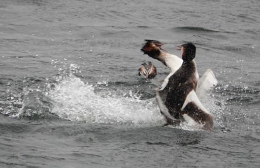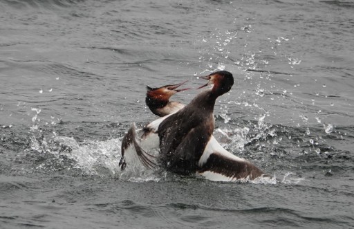 We had a well attanded walk [18 participants] around Cosmeston this morning. It was nice to welcome a couple of new members. It was hard work but we managed a fairly respectable 37 species. Highlights at the start were a Water Rail and 2 Redpolls at the dipping pond and an adult Mediterranean Gull by E. lake. Minuses were dipping on Marsh Tit in Cogan Wood, and no Yellow-legged Gull. A highlight at the end was a flock of c.20 Siskins feeding in Alder by the golf course. Photos below include some I grabbed of a pretty viscious fight between Great Crested Grebes, caused by 2 pairs displaying within a few feet of each other. Robin, Great Tit and Blue Tit fed from my hand in Cogan Wood. Click here for the full list.