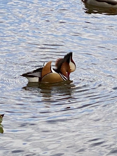 The male Mandarin Duck is still at Pwll y waun, looking resplendent in the autumn sun, constantly showing off and very often giving the resident mallards a ticking off.