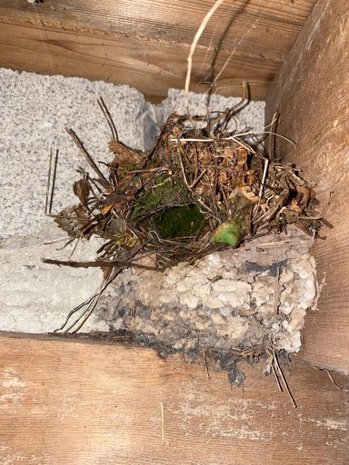 I noticed this morning that a wren has built its nest on top of an old Swallows nest high on a beam in our garage in work.