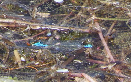 There were lots of Common Blue Damselflies at least a 100 many in tandem along with Red-eyed Damselfly new to us here Broad-bodied Chaser 2 female ovipositing Banded Demoiselle male and female Blue-tailed Damselfly 6 and Emperor dragonfly 1 male. A Lesser black backed Gull was seen to take and kill a Canada Goose gosling of which there were many.