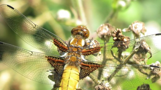 still Blackcap and Chiffchaff singing. Redstart male Raven 8 Green Woodpecker 1 Butterflies: Meadow Brown 10 Ringlet 20 Gatekeeper 12 Comma 1 Large White 4 Dragonflies: Four-spot chaser 1 Emperor 2 Broad-bodied Chaser 2 Emerald Damselfly 10 Azure Blue 8 Pics immature male Broad-bodied Chaser.